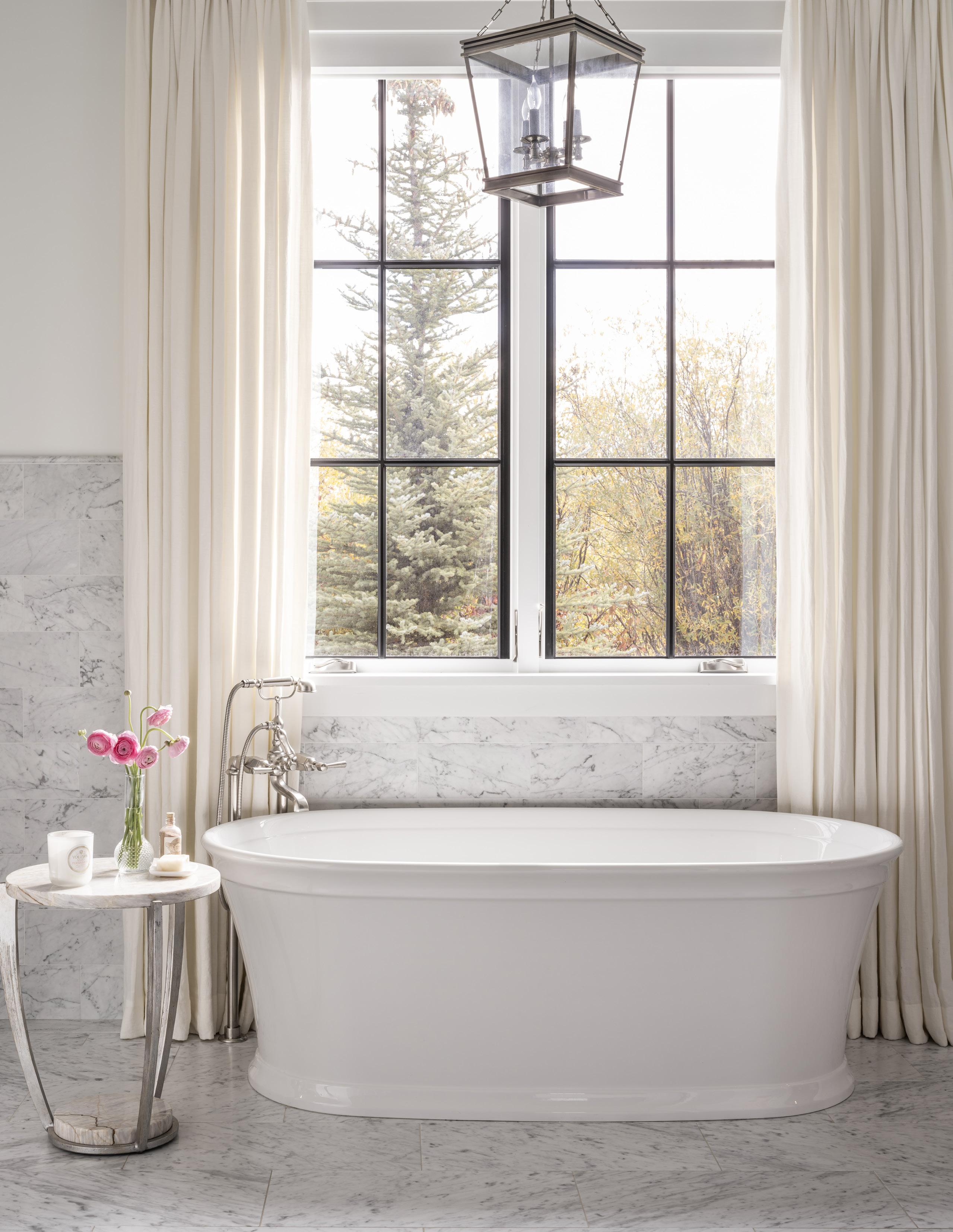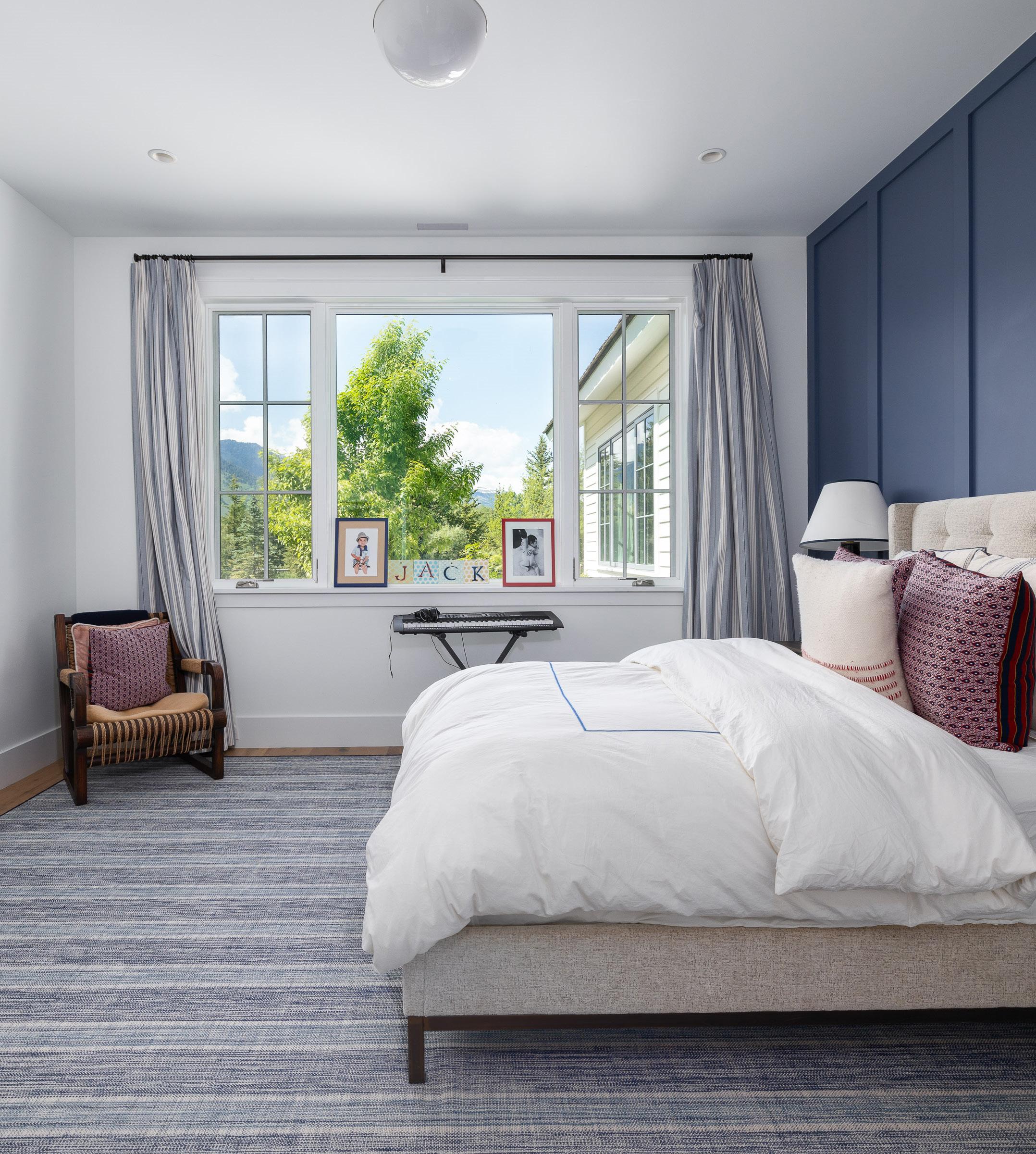 The bed faces a large floor-to-ceiling window that frames mountain views