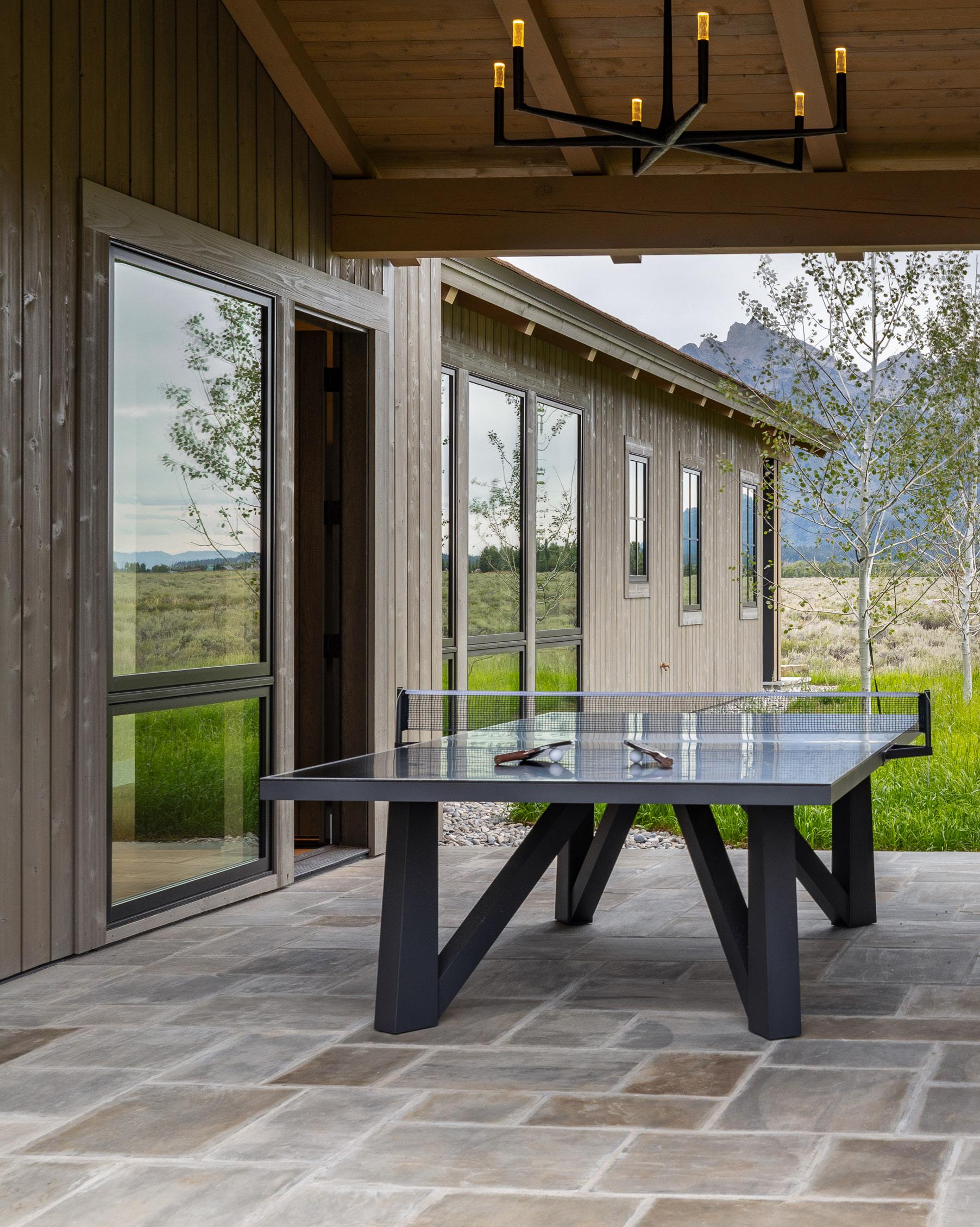 As you approach the glass storefront entry, the drama of the Tetons becomes a virtual extension of the foyer. The outdoor environment immediately feels part of the interior space. The natural cedar ceilings, interior weathered siding, white French oak flooring, plastered walls, sandstone floors, massive stone counter tops, solid European rift white oak cabinets and bespoke wall fabrics that grace the living spaces exude luxury.
