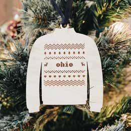 MATERIAL: 1/8” Birch wood DESIGN: Vintage Sweater shape and fair isle etched design with state or city name SIZE: ~3.5”w x 4.5”h FINISH: NA/Natural MSC: Hangs on a black satin ribbon. There is no set up fee for new cities for this item - 2 case pack minimum.