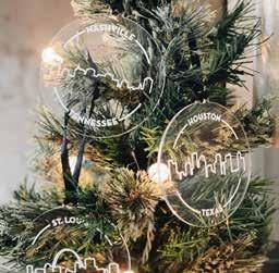 MATERIAL: 1/4” birch wood or 1/8” clear or frosted acrylic DESIGN: City coordinates in center with city name and state name around border SIZE: ~3.5”w x 3.5”h FINISH: NA/Natural MSC: Hangs on a black satin ribbon There is no set up fee for new cities for this item - 2 case pack minimum.
