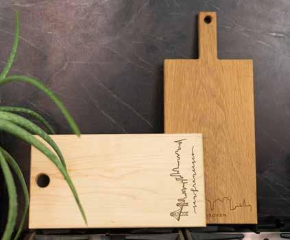 Design options include city skylines with script or block font for city name. MATERIAL: Maple | Oak | Sapele SIZE: 7”w x 13”h | 7”w x 16”h (with handle) - Oak only | 10”w x 13”h FINISH: Food-safe mineral oil