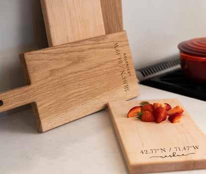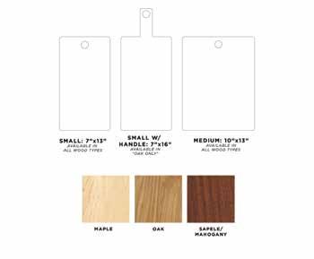 Design options include city coordinates with script or block font for city name. MATERIAL: Maple | Oak | Sapele SIZE: 7”w x 13”h | 7”w x 16”h (with handle) - Oak only | 10”w x 13”h FINISH: Food-safe mineral oil