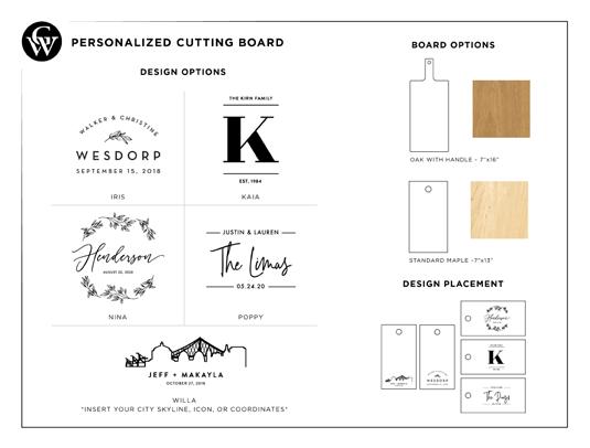 MATERIAL: 2 options - oak and maple SIZE: 7”x13” or 10”x13” oak or maple, 7”x16” oak (with handle) DESIGN: 5 of our most popular options Enter in your order on our website, we will send invoice with shipping + drop ship fee within 1 business day. Once order is paid, expect 5-10 business days for shipment.