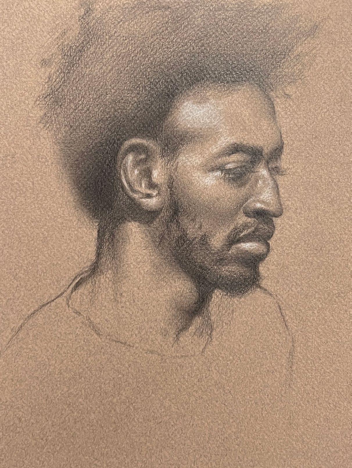 AUTO-PORTRAIT, 8.5’’X 7’’, GRAPHITE AND WHITE CHALK ON TONED PAPER