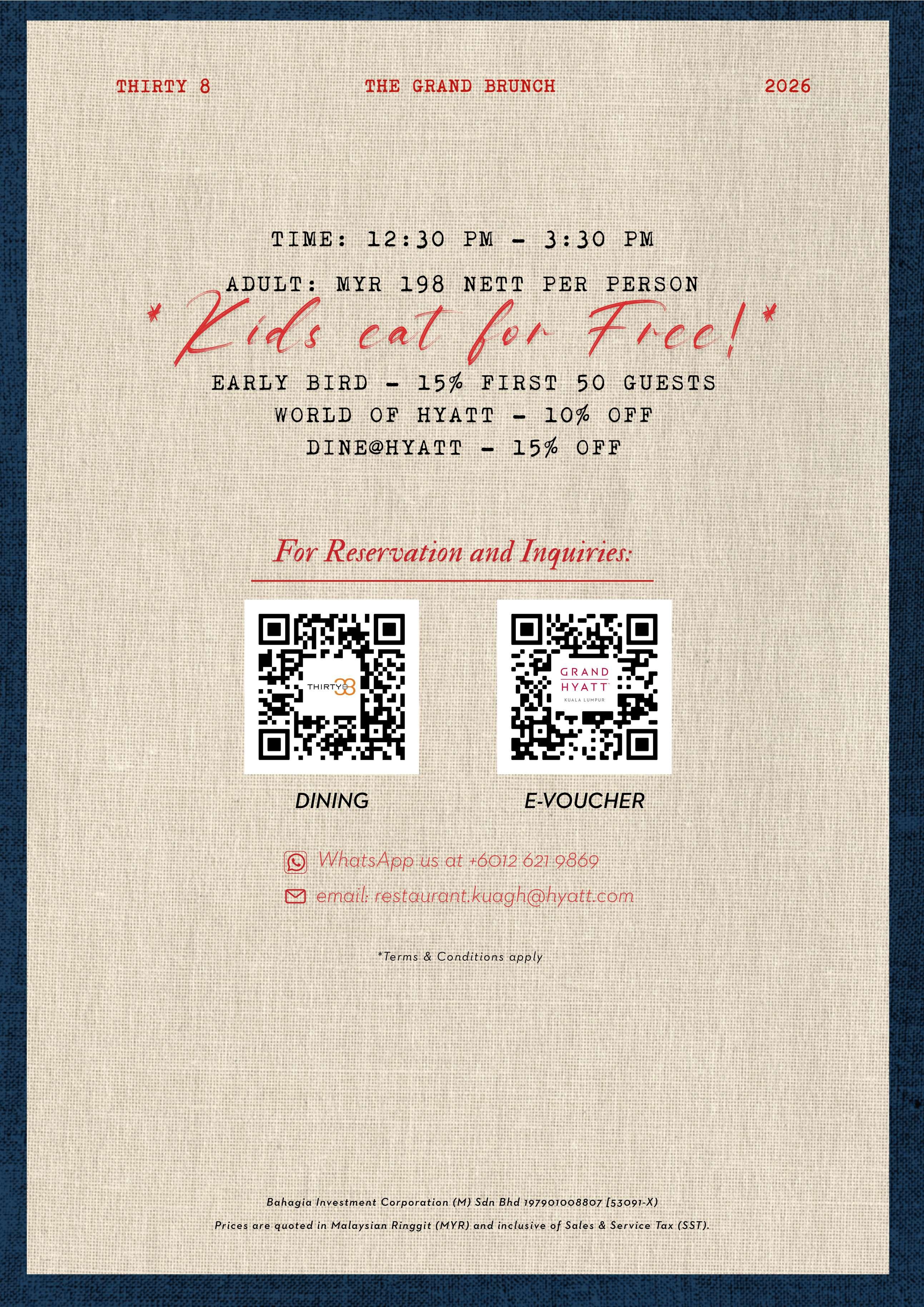 Price: MYR 198 nett per adult (Complimentary dining for children below 12 years old)