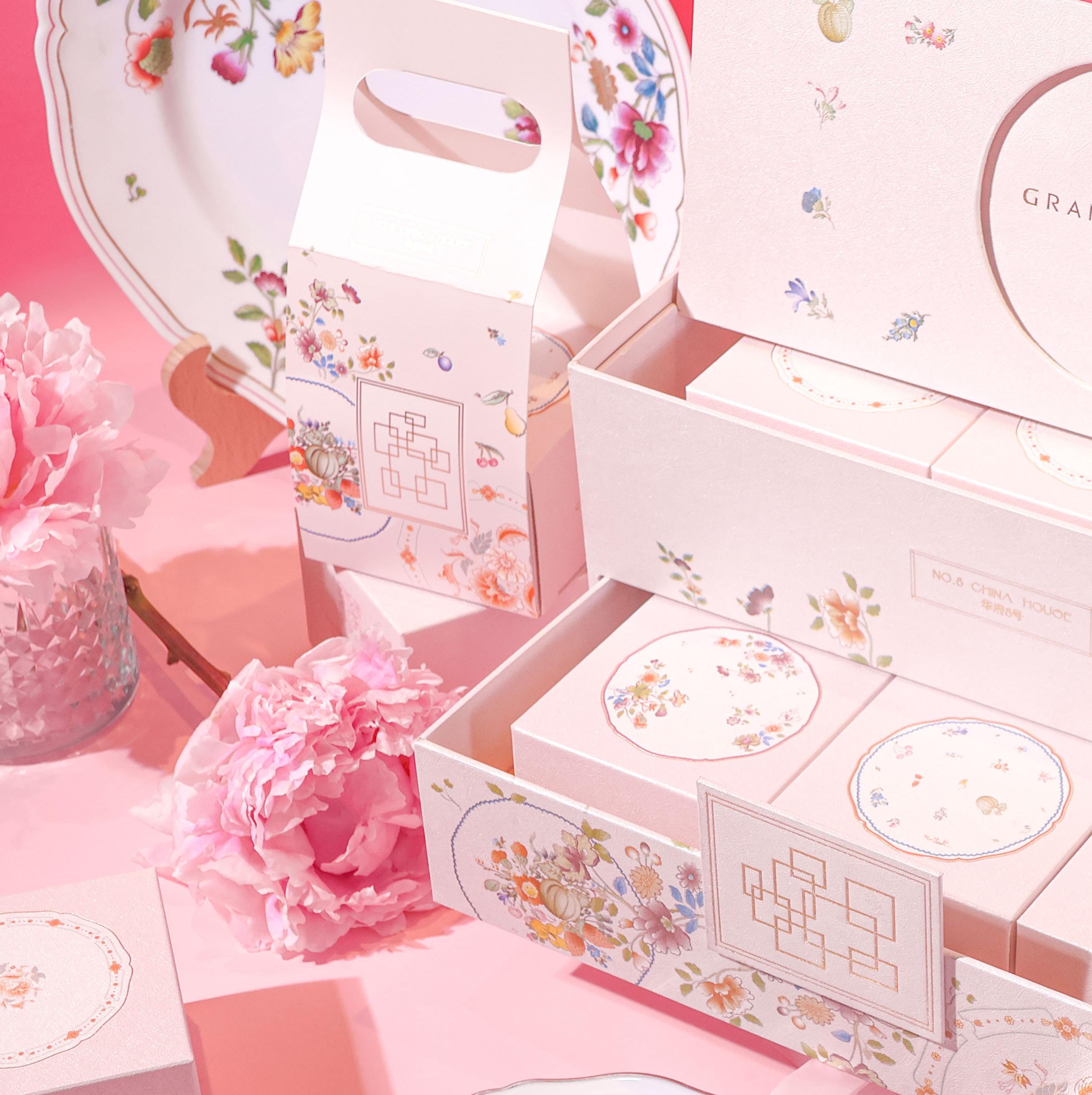 This year’s box glows in soft pink, adorned with floral plate patterns inspired by the elegant tableware of No. 8 China House – a quiet tribute to heritage, refinement and the art of gathering.