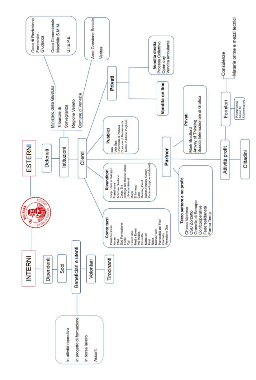 Dalla mappa si evince come il “gruppo clienti” rappresenti una parte consistente e come sia a sua volta diversificato ed eterogeneo; dalla piccola bottega del commercio equo alle grandi società/aziende di livello internazionale, tutti si fanno promotori dei nostri progetti.