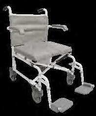 La carrozzina presenta un telaio bianco in alluminio con protezione completa dall’acqua ed è dotata di quattro ruote da 5” e due ruote posteriori da 24” estraibili per permettere una maggiore indipendenza dell’utente. Le ruote sono dotate di freno. La seduta e i braccioli sono in schiuma poliuretanica morbida. La seduta ha una sezione rimovibile, lo schienale è morbido, rimovibile e lavabile