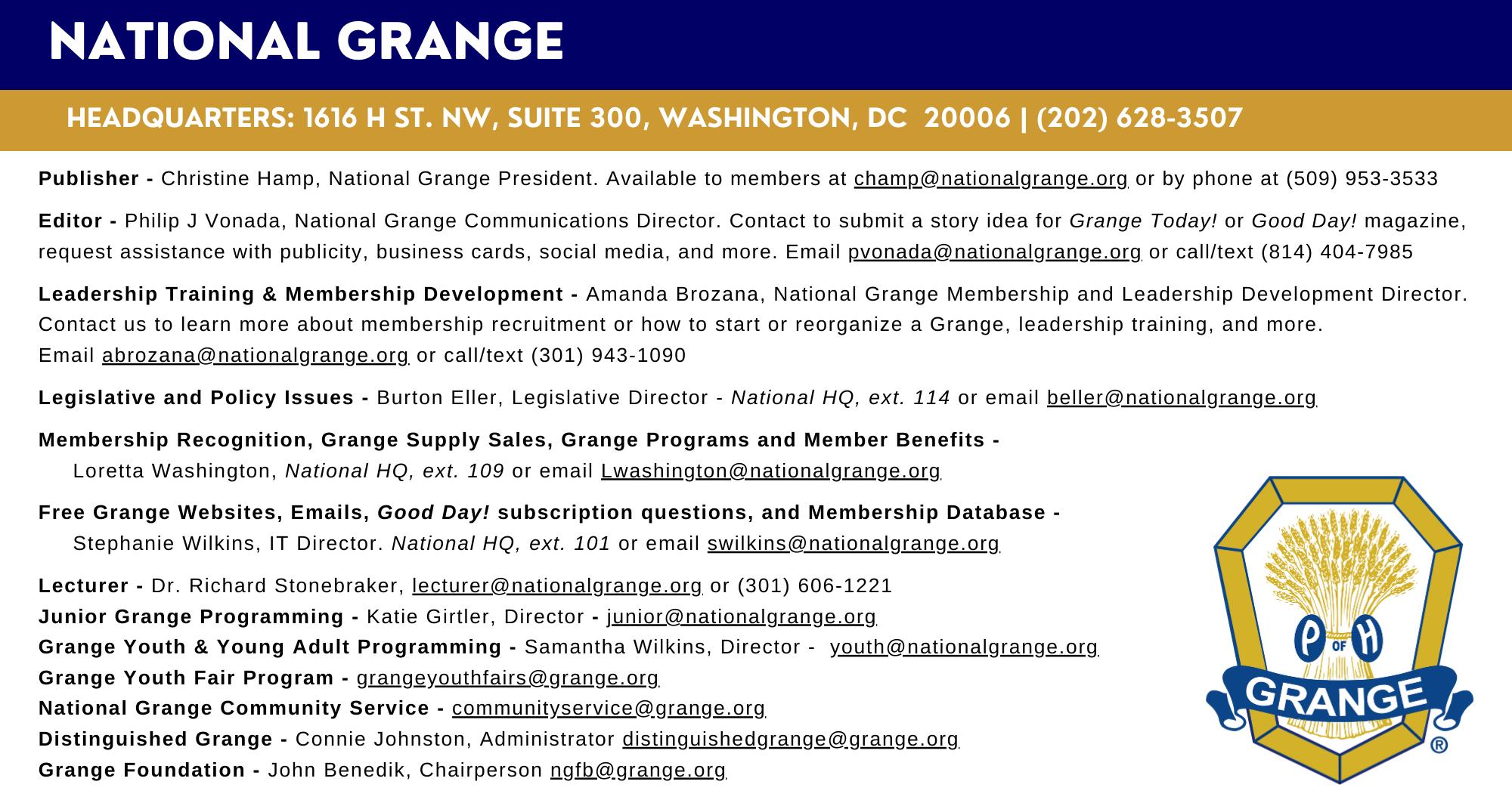 The National Grange is conducting a brief 12-question survey to help inform the direction, priorities, and overall look of the organization in the months and years ahead. Your feedback will directly guide how we tell our story, connect with communities, and ensure the Grange remains relevant, welcoming, and impactful for future generations.