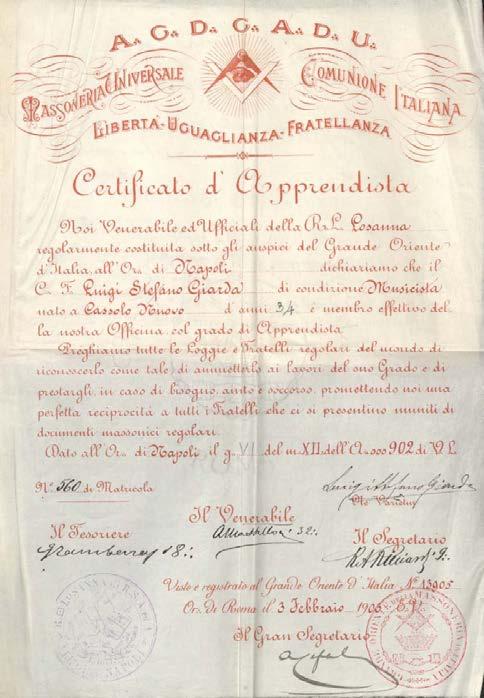 Este primer diploma contenido en el pasaporte, es un vestigio que da cuenta de un hecho histórico ocurrido el día 3 de febrero del año 1903, cuando se hace entrega de un Certificado de Grado de Aprendiz al señor Luigi Stefano Giarda Giudice y que lo reafirma como miembro de la masonería, otorgándole los derechos anexados al grado representado.