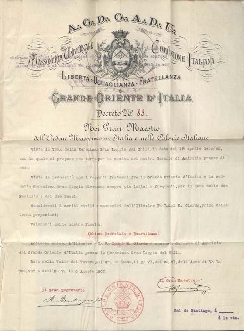 Decreto N°83, entregado por el Gran Oriente de Italia a Luigi Stefano Giarda Giudice como representante en las dependencias de la Gran Logia de Chile