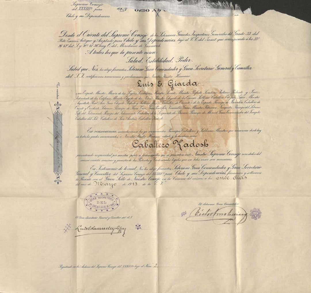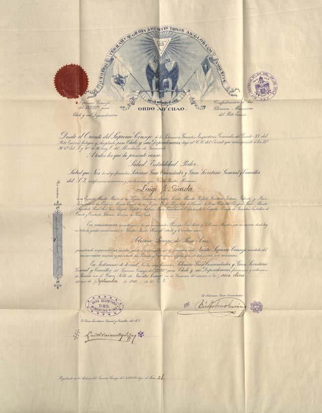del S. I., y contiene en su interior la divisa “Gran Secretaría del Sup.·. Consejo G.·. 33 del Or.·. Chile”, rodeada de 14 estrellas. El segundo timbre está al costado derecho de la firma de Luis Navarrete y López. Está en tinta azul y contiene el número 33 al interior de la escuadra y el compás. Finalmente, el tercer timbre se ubica al costado derecho de la firma de Víctor Guillermo Ewing. Timbrado en tinta azul y en su interior se observa el número 33, dentro de la escuadra con 48 destellos saliendo de él. El primer sello se encuentra en el costado izquierdo superior y solo se observan vestigios de él. El segundo es un sello de agua con la representación del Escudo Nacional con el caballo, lo que validaría su antigüedad.