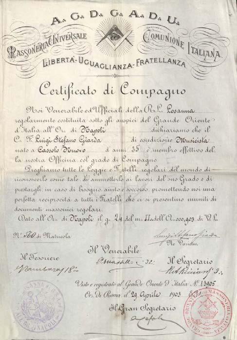 Este segundo diploma, contenido en el pasaporte, es un vestigio de un hecho histórico ocurrido el 24 de febrero de 1903, cuando se hace entrega del presente diploma que confirma la obtención del grado de compañero de Luigi Stefano Giarda Giudice, otorgado por la Respetable Logia Losanna N° 205 del Gran Oriente de Nápoles (Gran Oriente de Italia), reafirmando al Sr. Giarda como miembro de la masonería y otorgándole tanto lo derechos como los deberes acordes al grado que se le confiere.