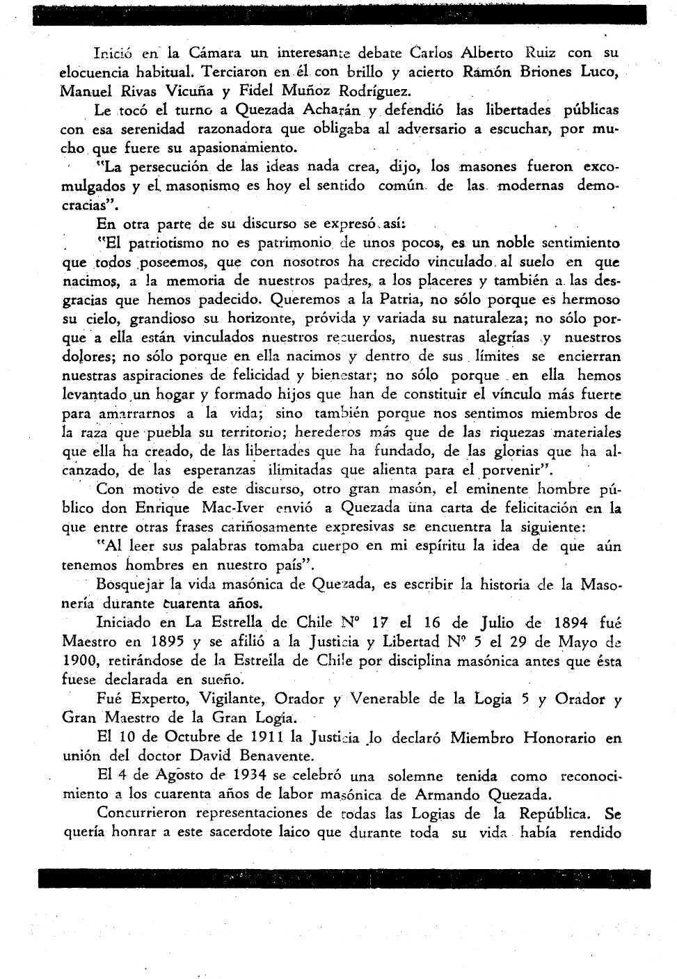 Con motivo de este discurso, otro gran masón, el eminente hombre público don Enrique Mac-Iver envió a Quezadá una carta de felicitación en la que entre otras frases cariñosamente expresivas se encuentra la siguiente: