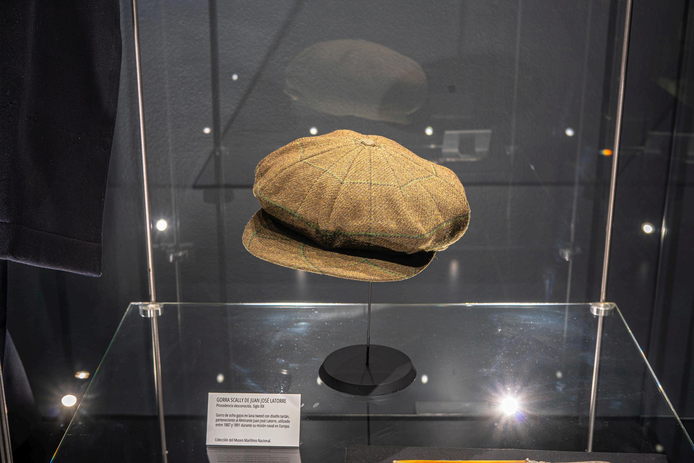 Gorro de ocho gajos en lana tweed con diseño tartán, perteneciente al Almirante Juan José Latorre, utilizado entre 1887 y 1891 durante su misión naval en Europa.