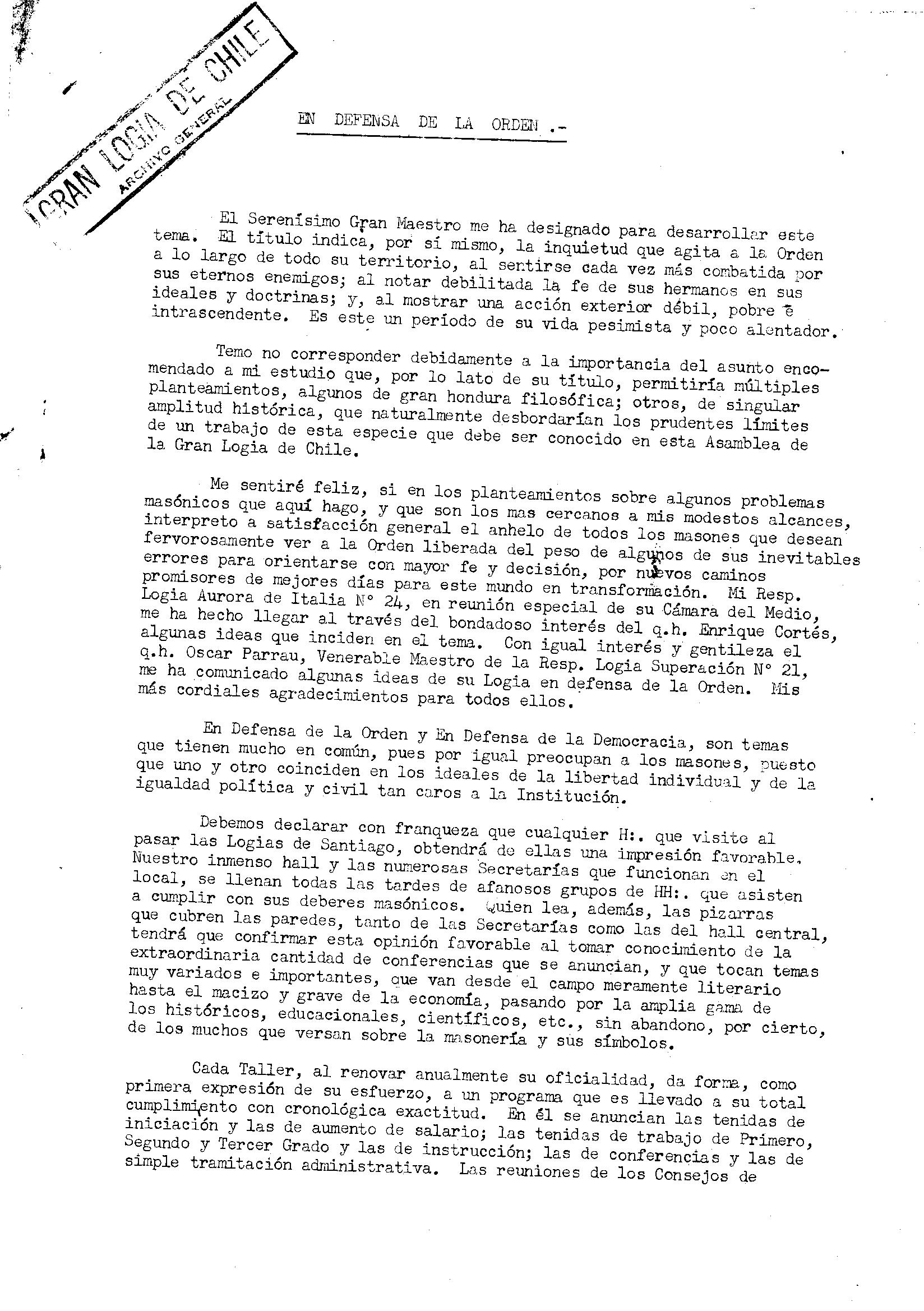 Extracto de la presentación hecha por el V:. H:. Aristóteles Berlendis Sturla, en Asamblea de la Gran Logia de Chile, el 09 de junio de 1957.