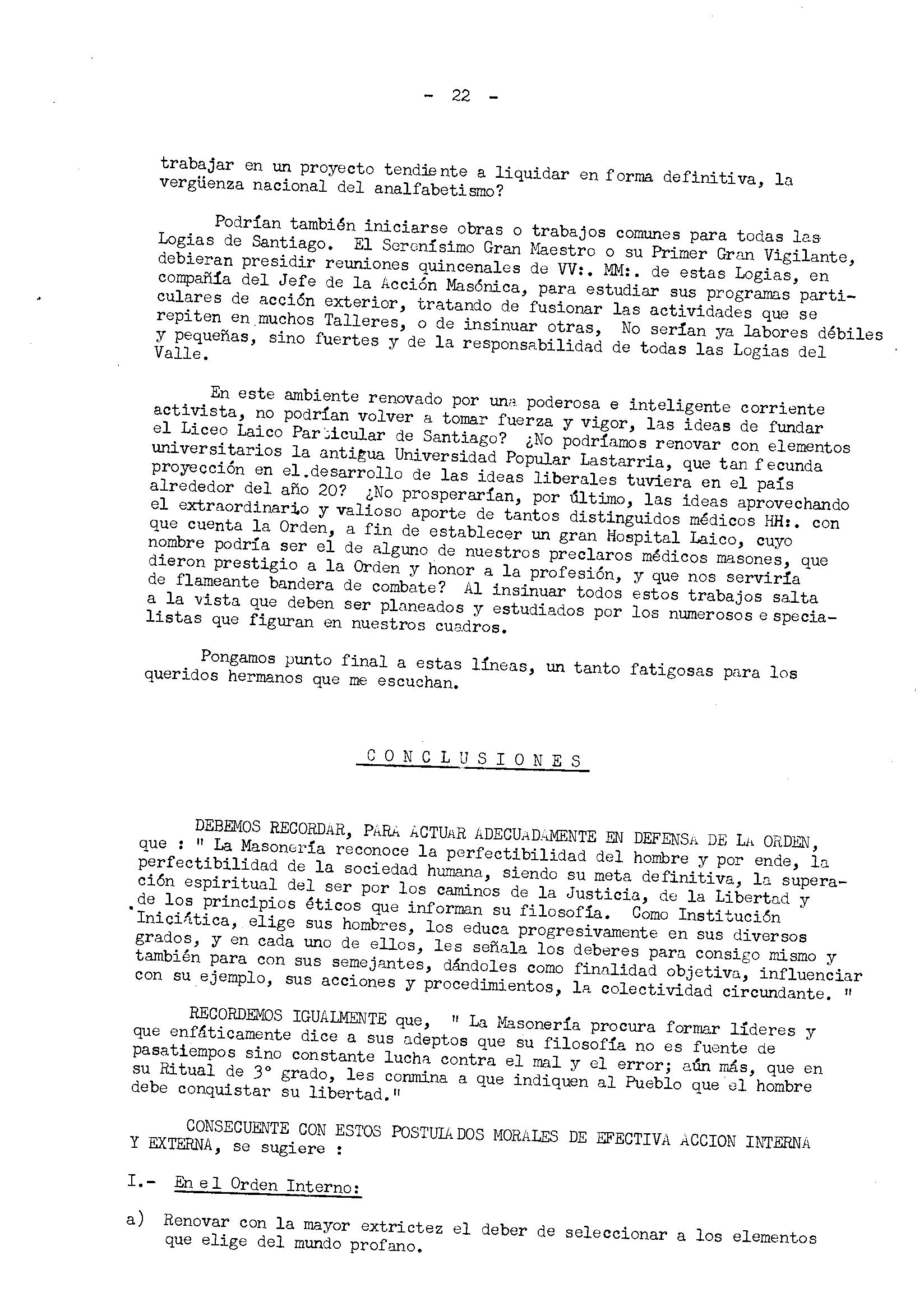 En este ambiente renovado por uw poderosa e inteligente corriente activista, no podrían volver a tomar fuerza y vigor, las ideas de fundar el Liceo Laico ParAcular de Santiago? ¿No podríamos renovar con elementos universitarios la antigua Universidad Popular Lastarria, que tan fecunda proyección en el.desarrollo de las ideas liberales tuviera en el país alrededor del ano 20? ¿No prosperarían, por último, las ideas aprovechando el extraordinario y valioso aporte de tantos distinguidos médicos HH:. con que cuenta la Orden, a fin de establecer un gran Hospital Laico, cuyo nombre podría ser el de alguno de nuestros preclaros médicos masones, que dieron prestigio a la Orden y honor a la profesión, y que nos serviria de flameante bandera de combate? Al insinuar todos estos trabajos salta a la vista que deben ser planeados y estudiados por los numerosos especia- listas que figuran en nuestros cuadros.