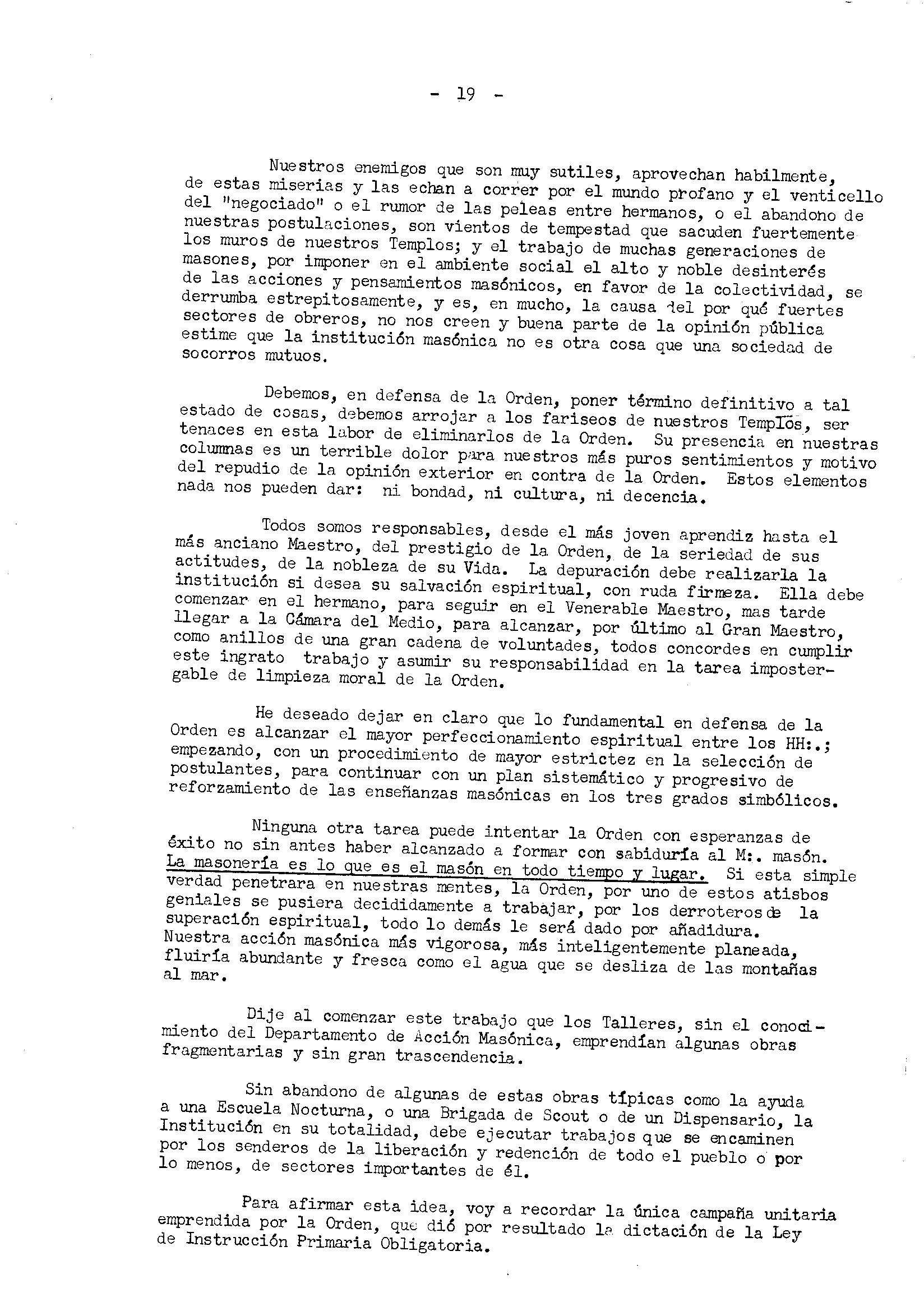 He deseado dejar en claro que lo fundamental en defensa de la Orden es alcanzar el mayor perfeccionamiento espiritual entre los HH:.; empezando, con un procedimiento de mayor estrictez en la selección de postulantes, para continuar con un plan sistemático y progresivo de reforzamiento de las enseñanzas masónicas en los tres grados simbólicos.