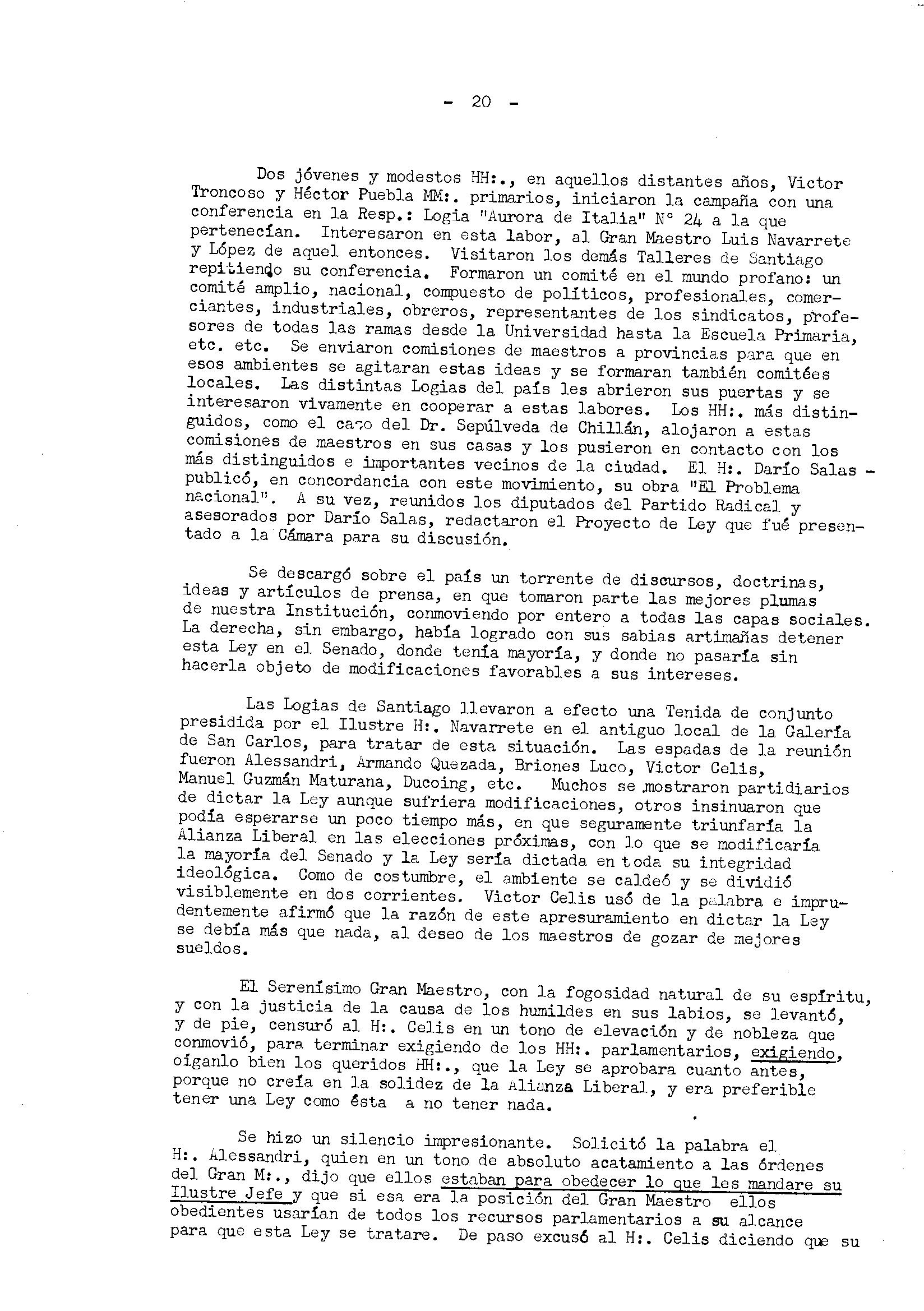 Dos jóvenes y modestos HH:., en aquellos distantes anos, Victor Troncoso y Héctor Puebla MM:. primarios, iniciaron la campana con una conferencia en la Resp.: Logia "Aurora de Italia" N° 24 a la que pertenecían. Interesaron en esta labor, al Gran Maestro Luis Navarrete y López de aquel entonces. Visitaron los demás Talleres de Santiago repitien4o su conferencia. Formaron un comité en el mundo profano: un comité amplio, nacional, compuesto de políticos, profesionales, comerciantes, industriales, obreros, representantes de los sindicatos, 'n'oresoros de todas las ramas desde la Universidad hasta la Escuela Primaria, etc. etc. Se enviaron comisiones de maestros a provincias para que en esos ambientes se agitaran estas ideas y se formaran también comitées locales. Las distintas Logias del país les abrieron sus puertas y se interesaron vivamente en cooperar a estas labores. Los HH:. más distinguidos, COMO el ca,-;o del Dr. Sepúlveda de Chillán, alojaron a estas comisiones de maestros en sus casas y los pusieron en contacto con los más distinguidos e importantes vecinos de la ciudad. El H:. Darío Salaspublicó, en concordancia con este movimiento, su obra "El Problema nacional". A su vez, reunidos los diputados del Partido Radical y asesorados por Darío Salas, redactaron el Proyecto de Ley que fuó presentado a la Cámara para su discusión.