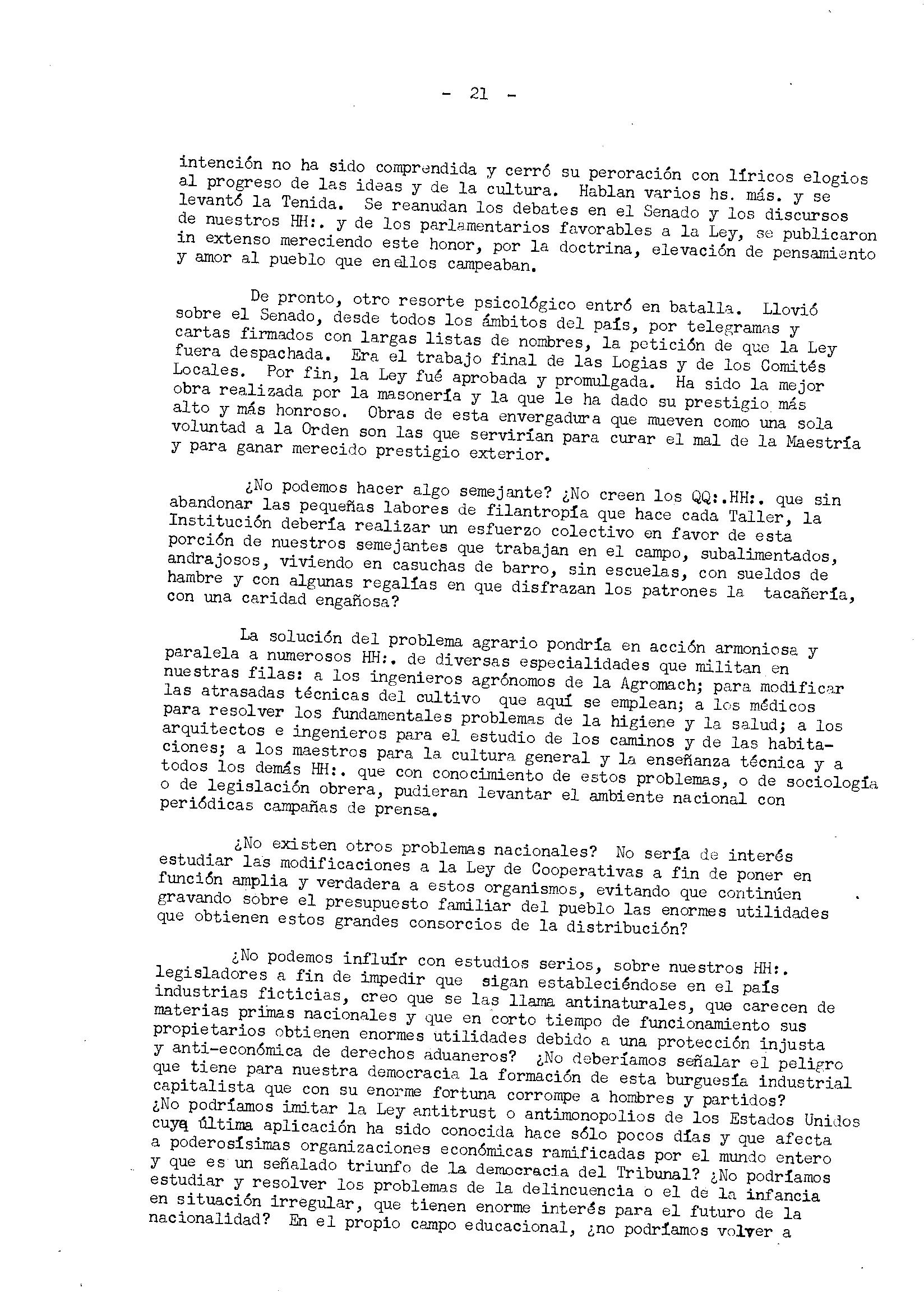 ¿No podemos influir con estudios serios, sobre nuestros HH:. legisladores a fin de impedir que sigan estableciéndose en el país industrias ficticias, creo que se las llama antinaturales, que carecen de materias primas nacionales y que en corto tiempo de funcionamiento sus propietarios obtienen enormes utilidades debido a una protección injusta y anti—económica de derechos aduaneros? ¿No deberíamos señalar el peligro que tiene para nuestra democracia la formación de esta burguesía industrial capitalista que con su enorme fortuna corrompe a hombres y partidos? ¿No podríamos imitar la Ley antitrust o antimonopolios de los Estados Unidos cuyq última aplicación ha sido conocida hace sólo pocos días y que afecta a poderosísimas organizaciones económicas ramificadas por el mundo entero y que es un señalado triunfo de la democracia del Tribunal? ¿No podríamos estudiar y resolver los problemas de la delincuencia o el de la infancia en situación irregular, que tienen enorme interés para el futuro de la nacionalidad? En el propio campo educacional, ¿no podríamos volver a