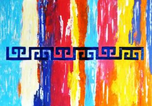 Composición abstracta con greca griega en centro, que alude a la trascendencia de las virtudes y la cosmovisión helénica a lo largo del tiempo, en diversas zonas del planeta.