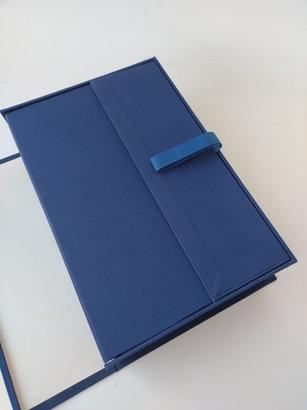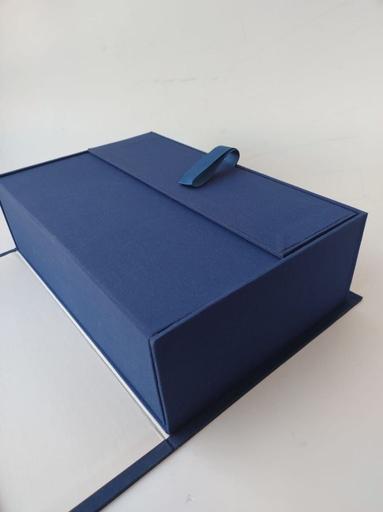 Caja confeccionada con tela Cialux azul marino en el exterior y papel libre de ácido Sirio color