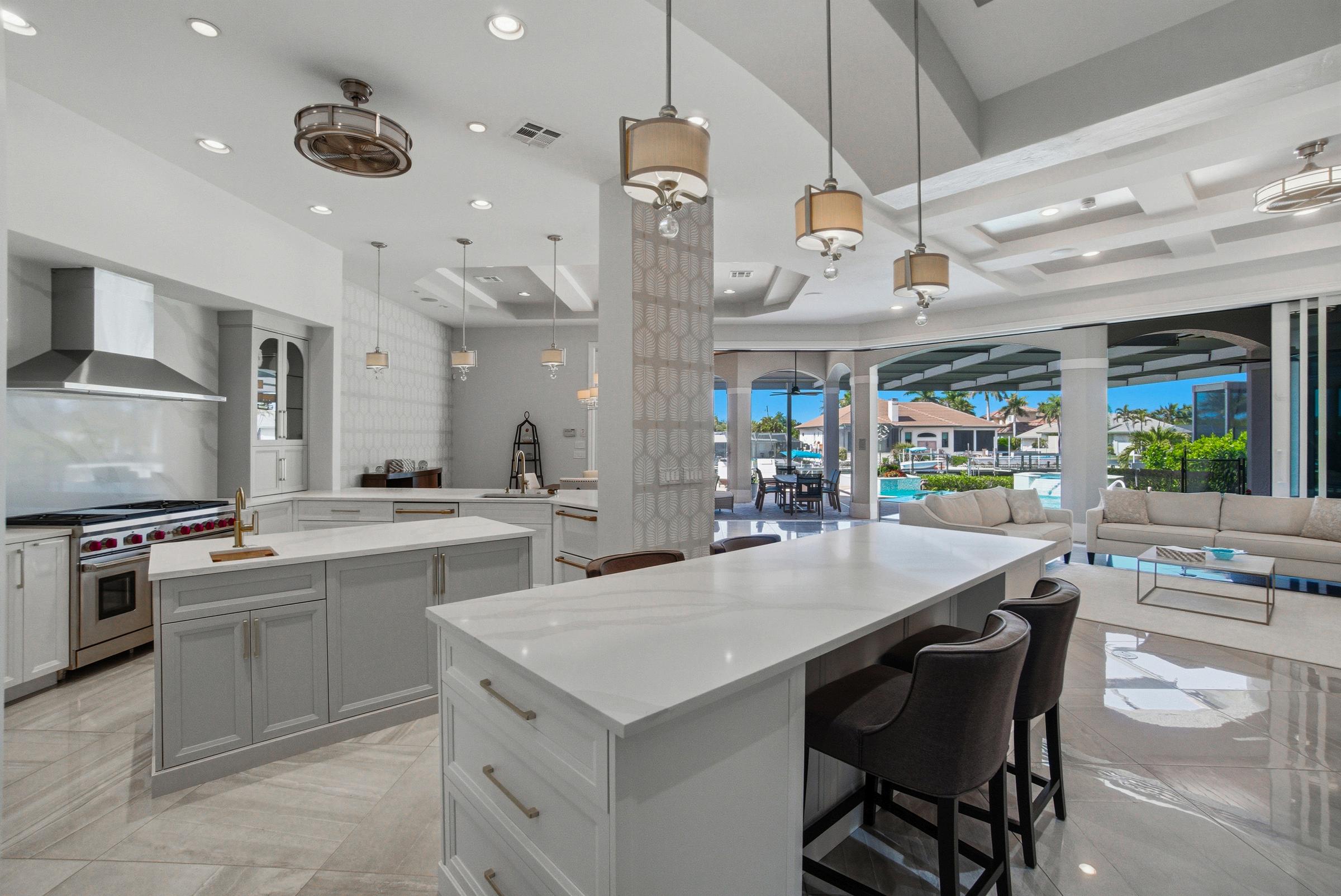 The desirable 2,485 sq ft split-bedroom floor plan offers privacy for both owners and guests, with two bedrooms plus a den that could easily be converted into a third bedroom, already offering en-suite access to a full bath Tasteful updates include impact glass sliding windows, a renovated kitchen with white custom cabinetry and quartz countertops, beautiful wood-look flooring in the main living areas, custom woodwork and wall paneling, and newly updated showers with tile and frameless glass enclosures