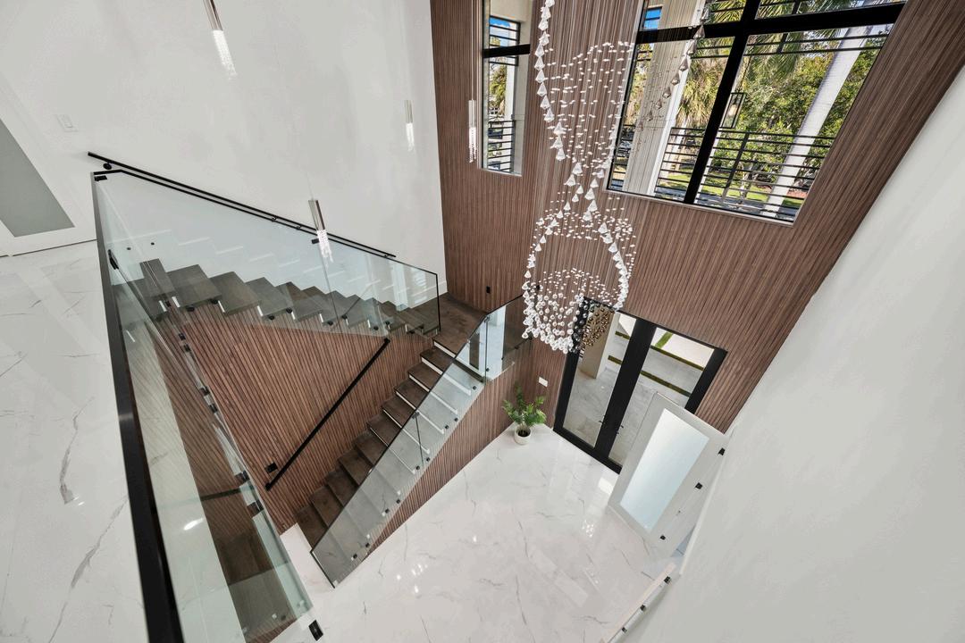 Dramatic two-story foyer with floating wood-and-glass staircase