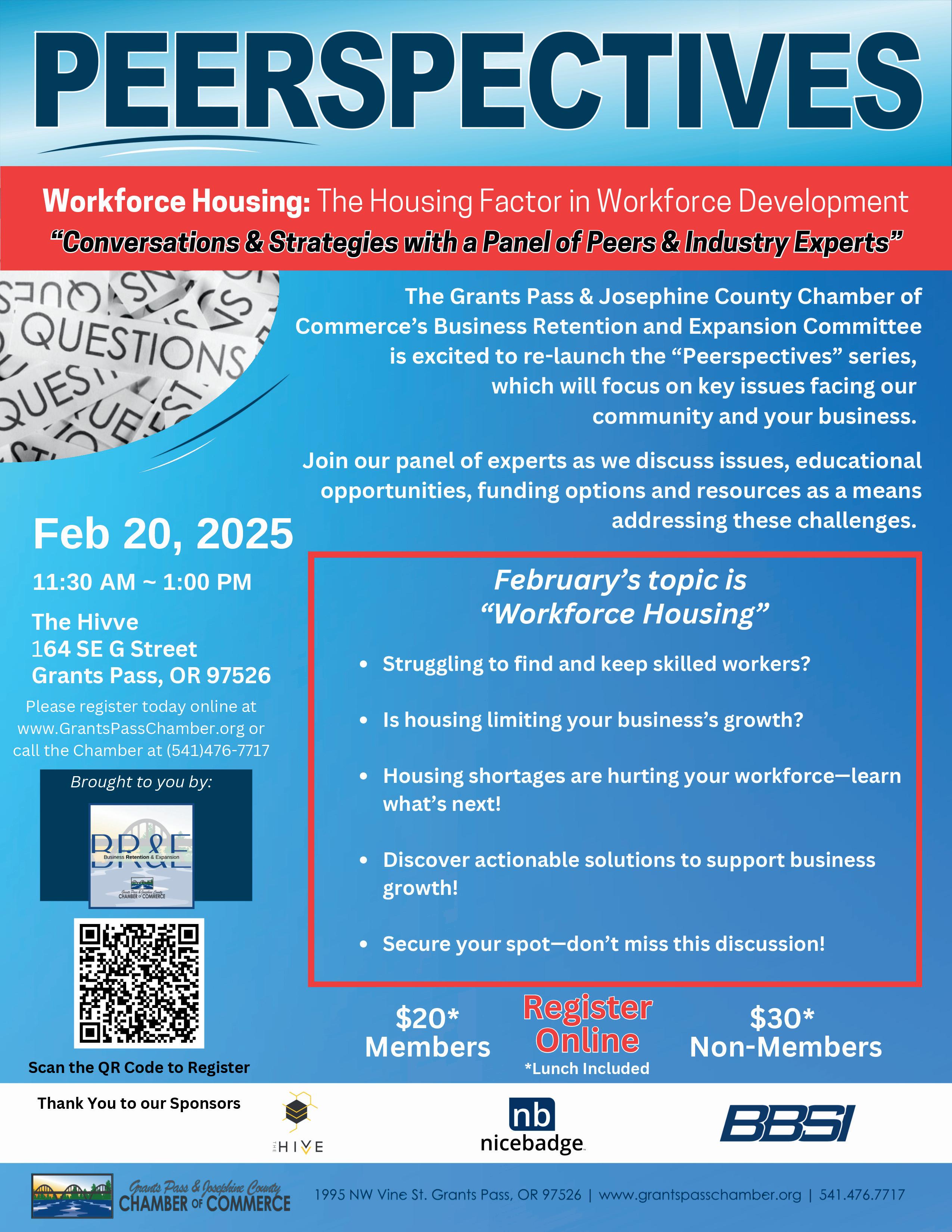 Closer to home, we see opportunities for collaboration that lie ahead with City and County leadership and our many strategic partners. The Chamber proudly represents businesses on critical committees, such as the City’s Budget Committee, Tourism Advisory Committees, Visit Grants Pass Board of Directors, Merchant Meetings and the Collaborative Economic Development Committee. Within our own ranks, the Business Retention & Expansion Committee, the Young Professionals Network, and the Government Affairs Committee continue to drive impactful initiatives. This month also starts our collaboration with local leaders as we make time to focus on Workforce Housing with our panel discussion at PEERSPECTIVES on Feb 20th and again in our sponsorship with the first session in the workshop series, “Build That Rental.”
