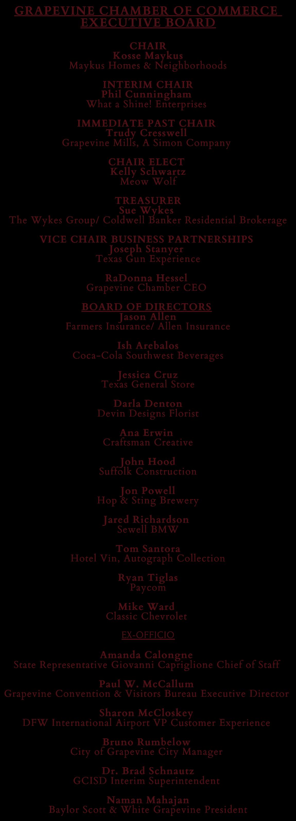 2023isgoingtobeagreatyearfortheGrapevineChamberofCommerce, andIknowthattheboardwillcontinuetostayfocusedonhelpingourfellow Chambermembers,andcommunitywith“212°-theextradegree”offocus!