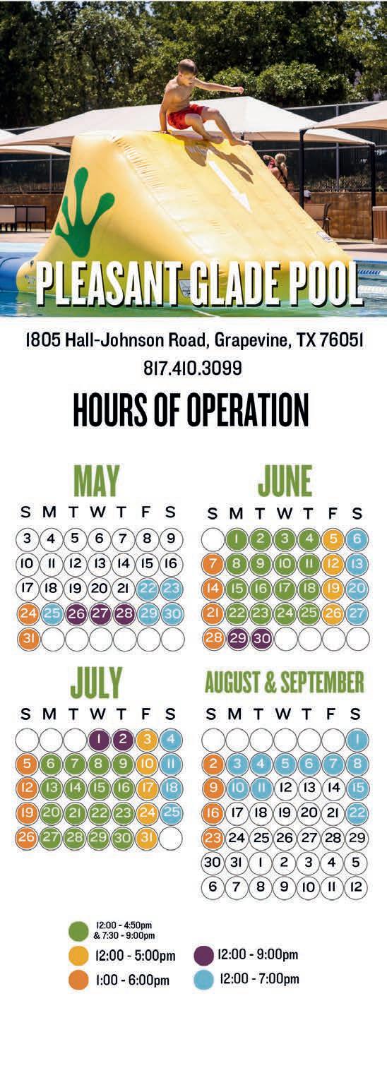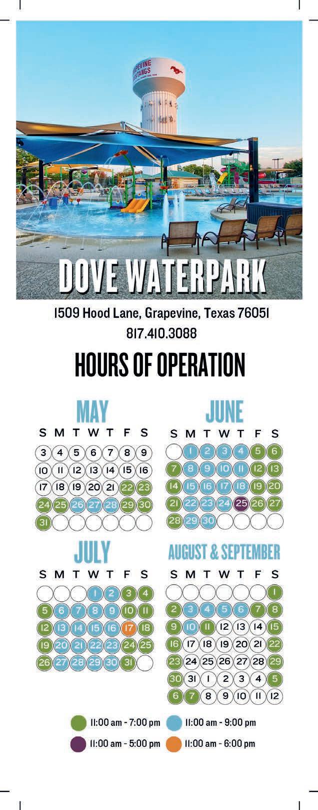 With summer just around the corner, our department is gearing up for a season full of activity, connection, and fun. Following months of preparation by our Athletics, Hospitality, and Parks Maintenance teams, we are proud to welcome the NCCAA Softball World Series to Grapevine May 18–20 at the Oak Grove Softball Complex. Our Lake Parks team will kick o Dove Creek Day Camp at the Meadowmere Adventure Center beginning May 26, o ering young adventurers a summer to remember. In June, our Aquatics team will participate in the World’s Largest Swim Lesson on June 25, promoting water safety and community engagement. We’ll round out the season by celebrating Parks and Recreation Month throughout July with special activities and events planned by our Community Events team.