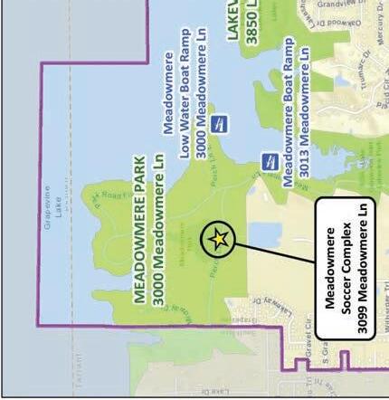 Meadowmere Park spans over 200 acres and o ers a wide range of enjoyable recreational activities. You can rent kayaks, jet skis, and stand-up paddleboards, swim at the beach, explore a state-of-the-art play structure, and hike an expansive trail system. The Day Use area features picnic shelters with grills, a group pavilion, and ample open space. To reserve the group pavilion, please contact the Park Gatehouse.