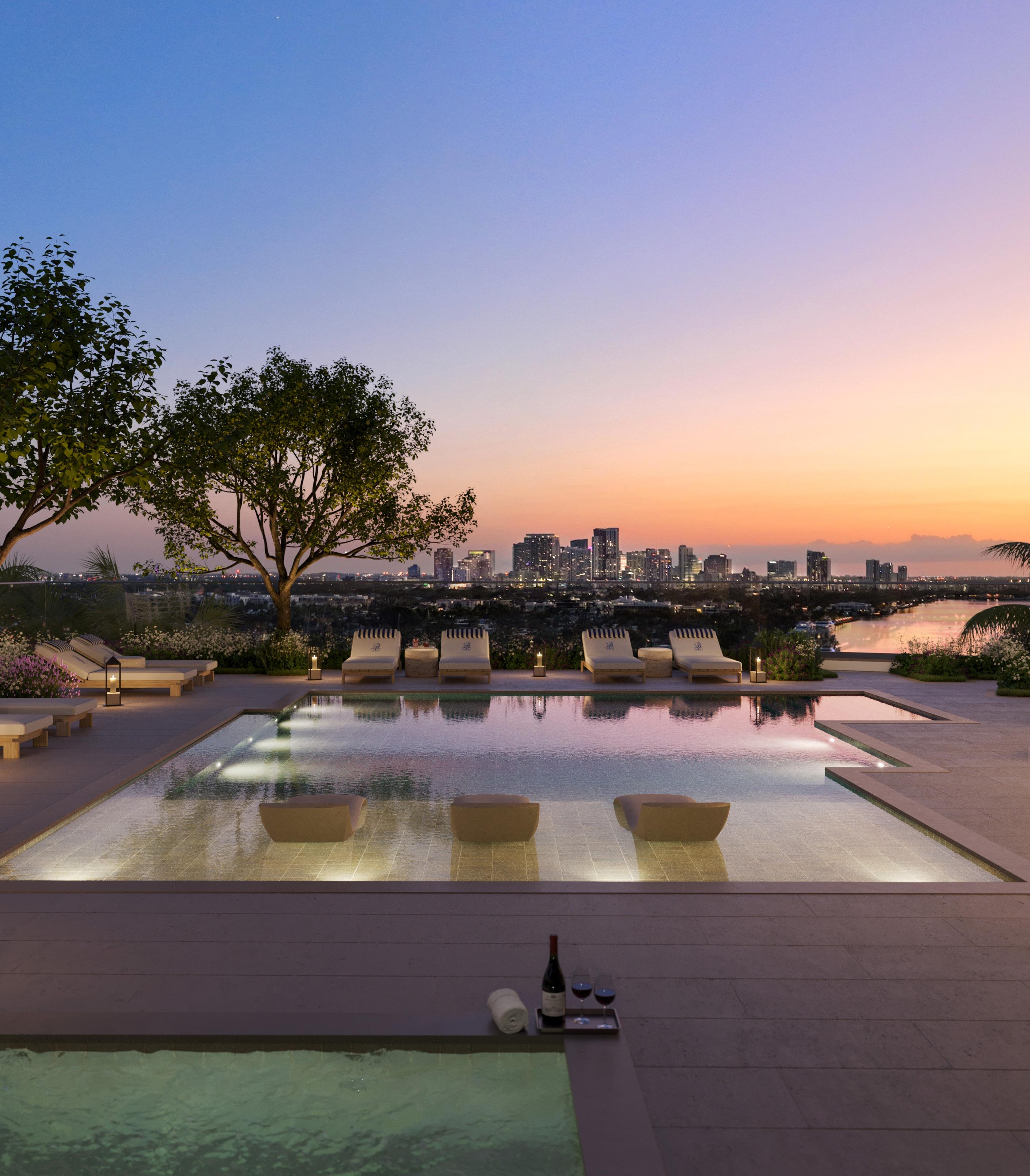 Additional spaces—a yoga lawn, library lounge, and rooftop sunset terrace overlooking the Intracoastal—are designed to enhance daily life rather than overwhelm it.