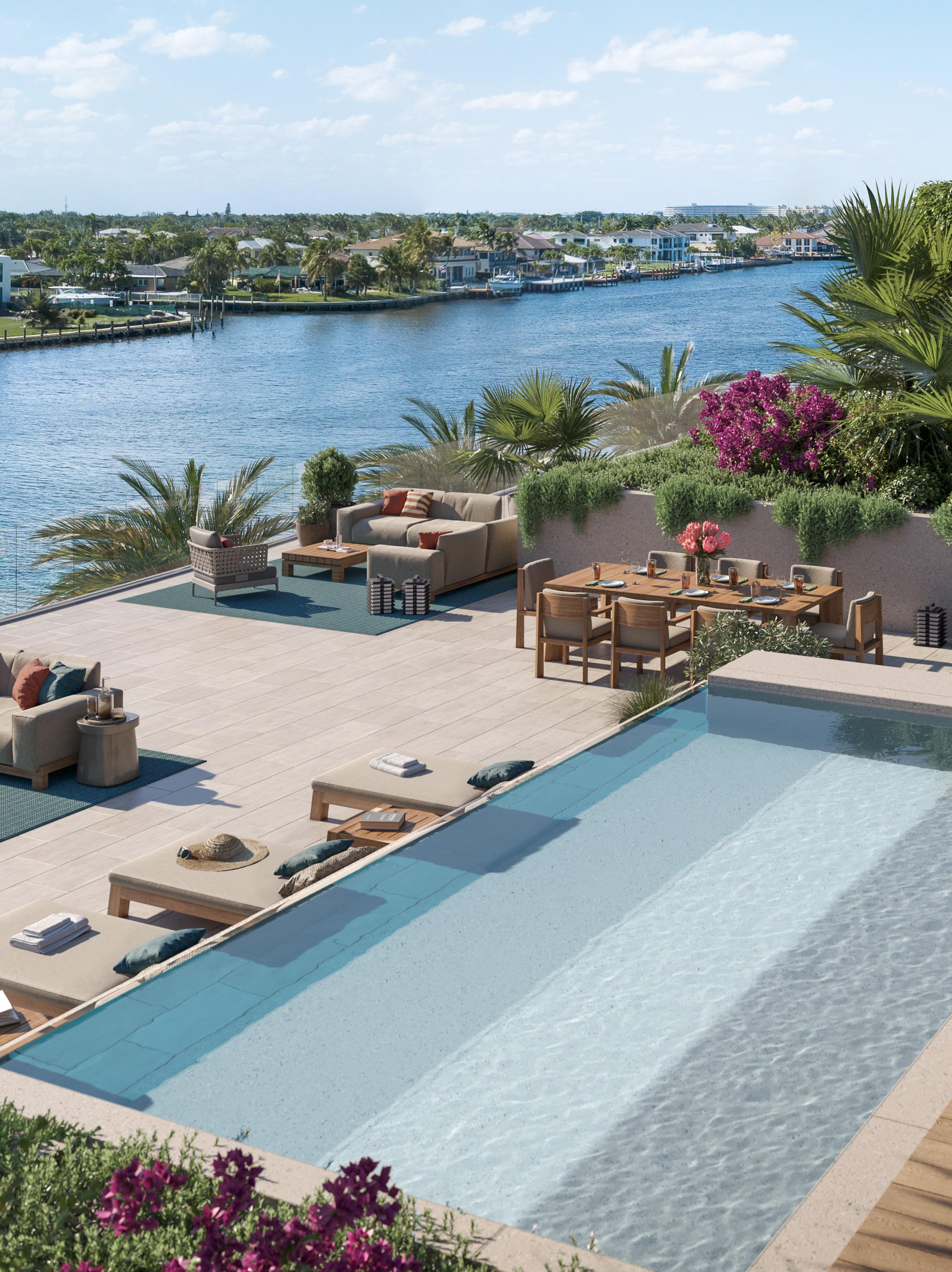 of the Indigo Penthouse signals both scale and scarcity. Spanning nearly 7,800 total square feet, with more than 5,600 square feet of interior space and a 2,150-square-foot wraparound terrace, the residence is de ned as much by its positioning as its size. Twin plunge pools placed on opposite sides of the terrace capture both sunrise over the Atlantic and sunset across the Intracoastal, anchoring the home to the full arc of the day.