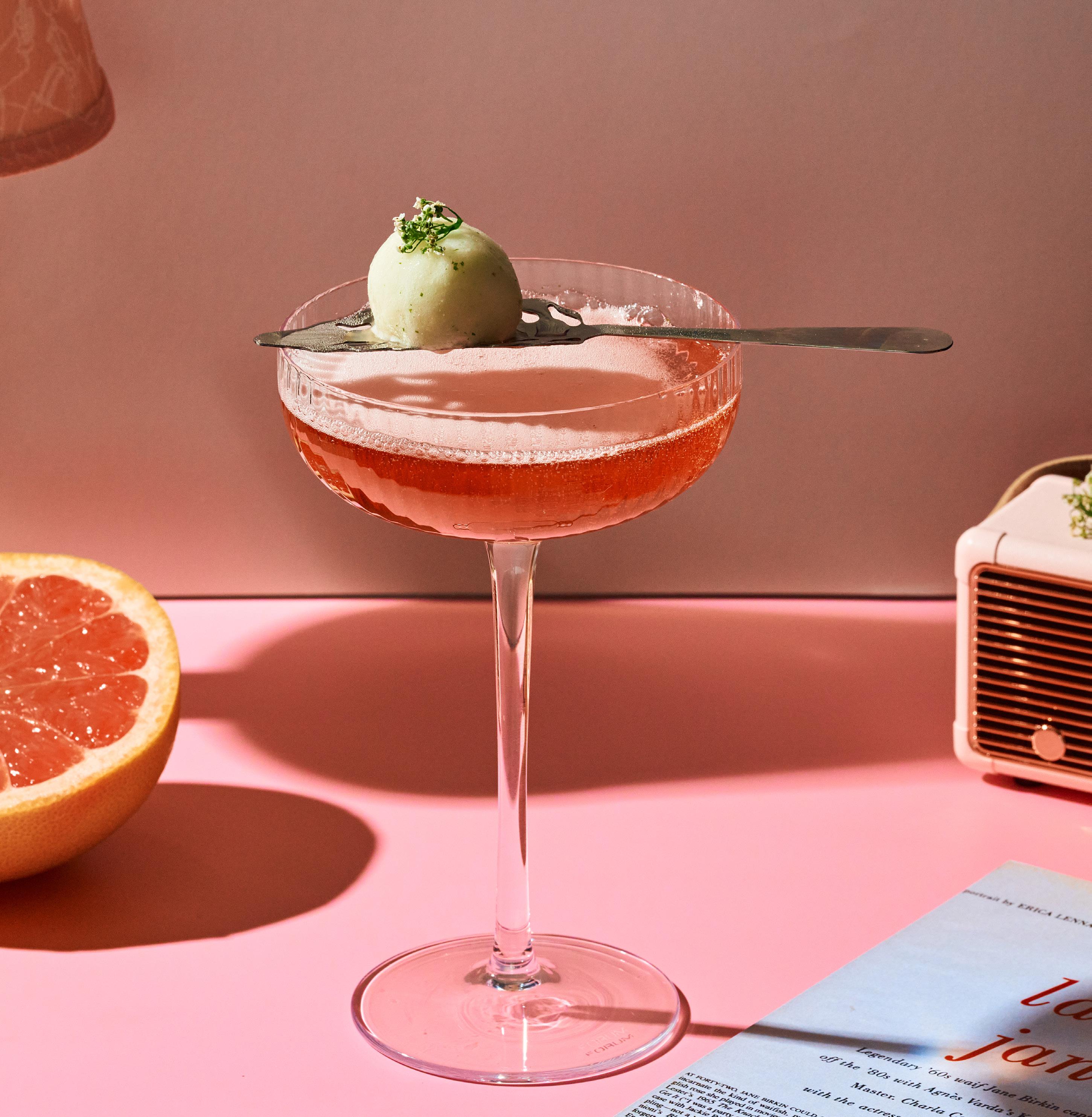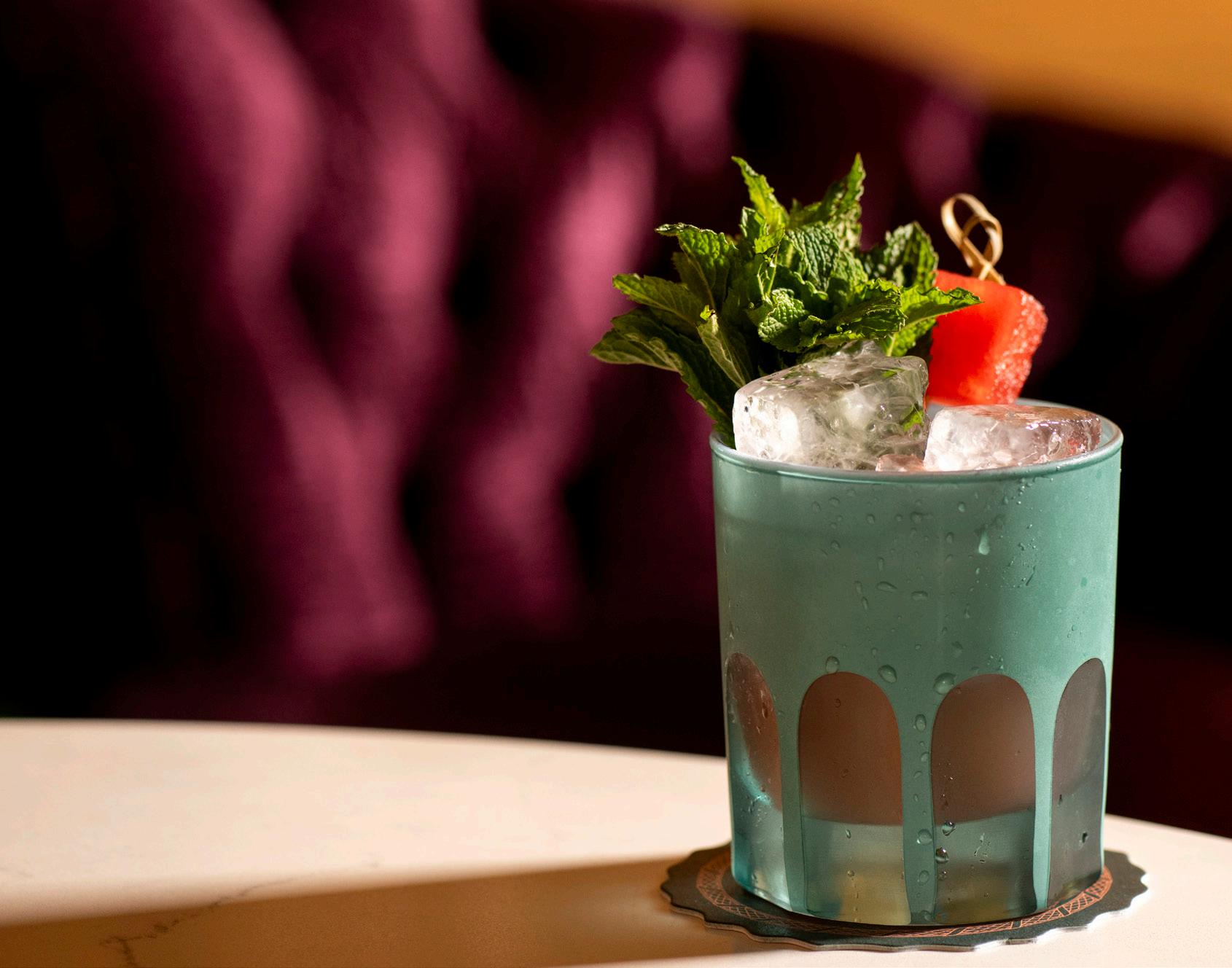 Above: The "Claudette's Caress" cocktail. Opposite: The Claudie Dining room.