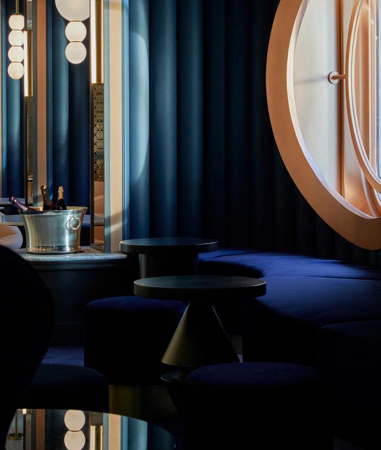 variations of ambient lighting are available in all cabins. Above: Sip is a sophisticated lounge that specializes in cocktails and offers traditional British afternoon tea.