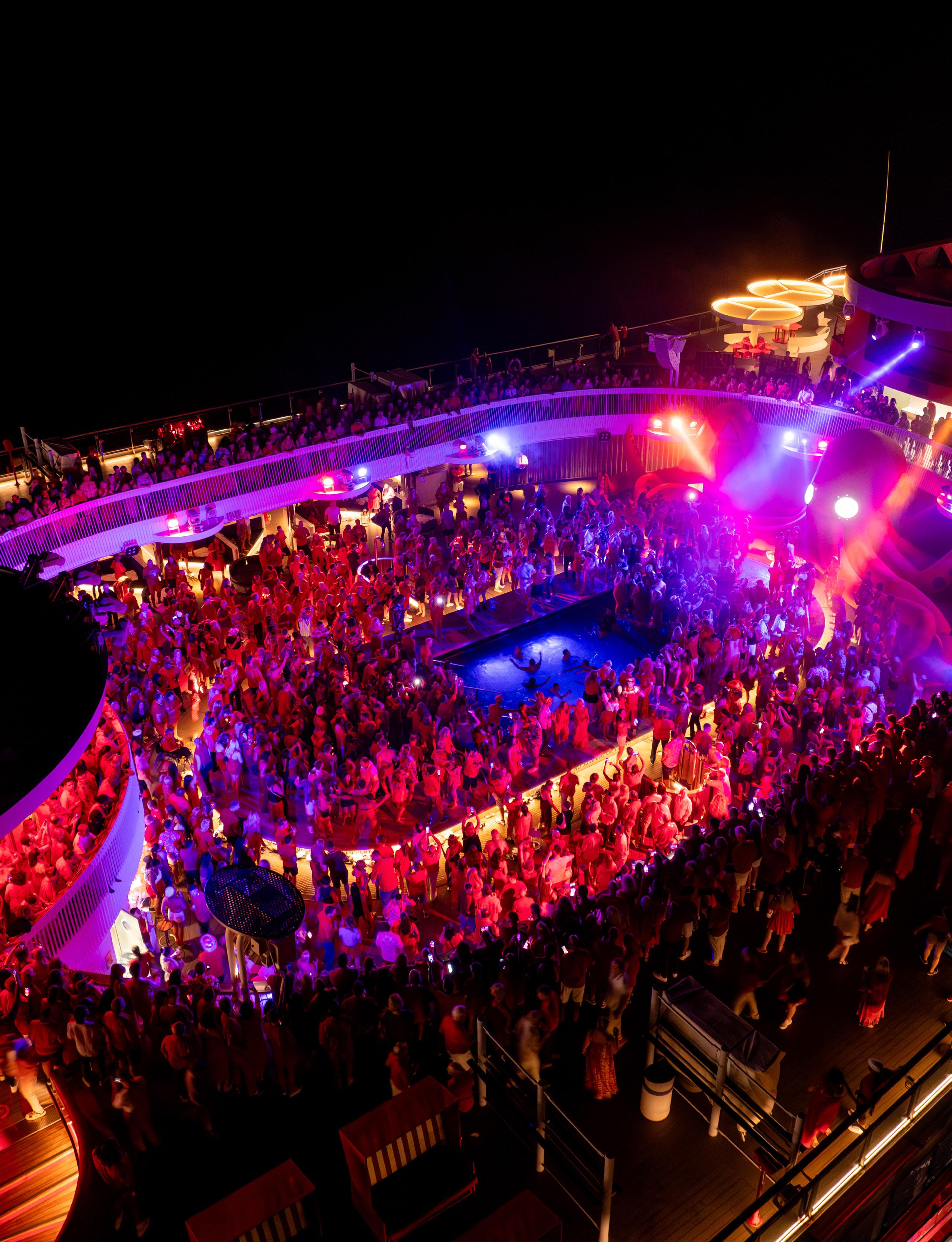 Scarlet Night, when guests wear red and join in a massive poolside dance party, is a highlight of every Virgin Voyages cruise.