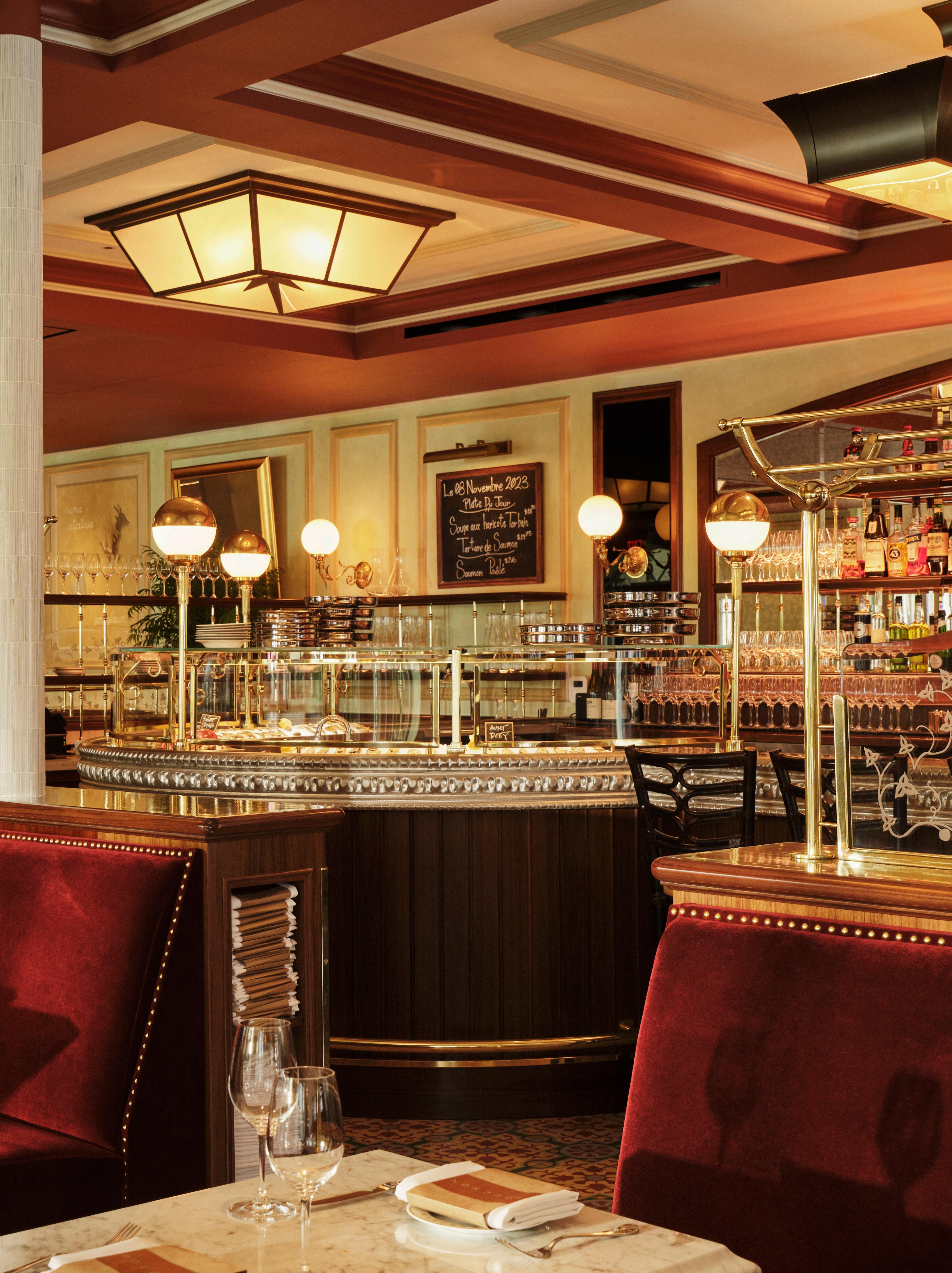 The interior of Bouchon Bistro, designed by Adam D. Tihany of Tihany Design, captures the perfect blend of old-world charm and contemporary elegance. The Mediterranean-style exterior, with its inviting central courtyard, leads into a space that feels both timeless and modern. Inside, the mosaic floors and zinc bar set a warm, welcoming tone, while the design elements nod to the classic French bistro, with updated touches that