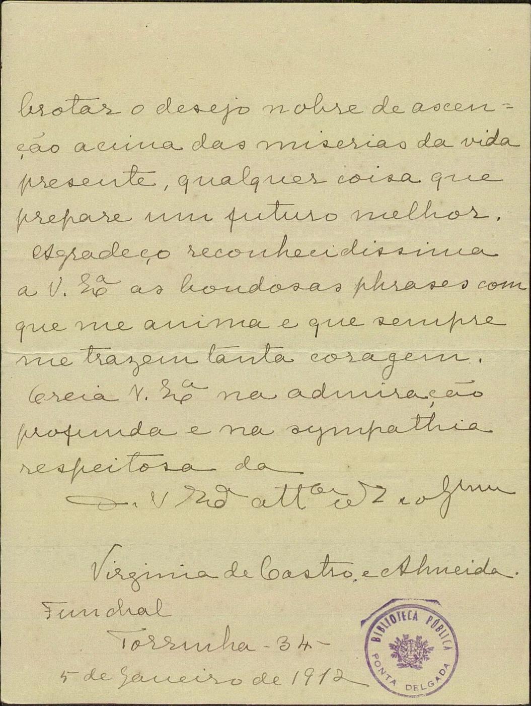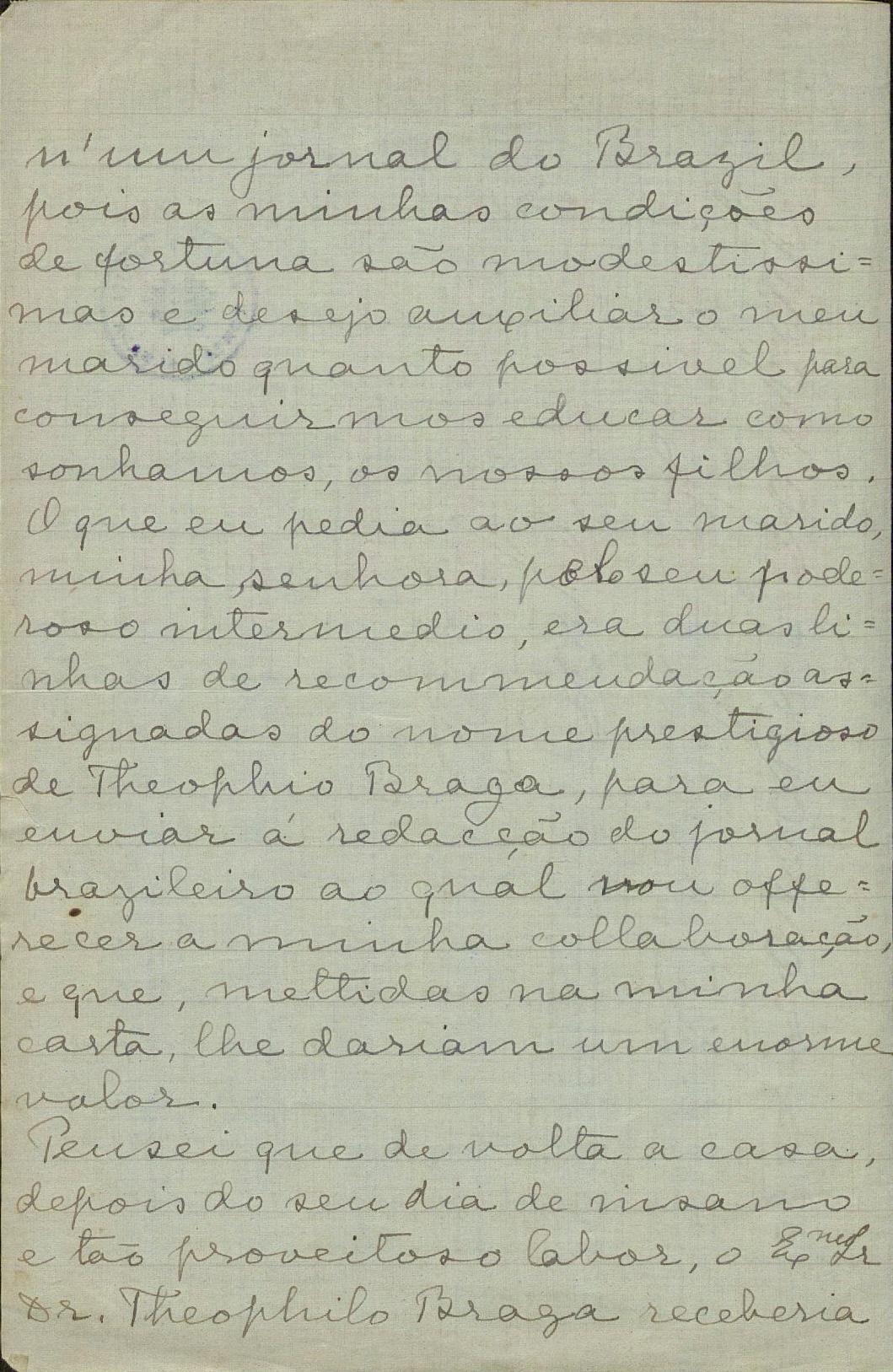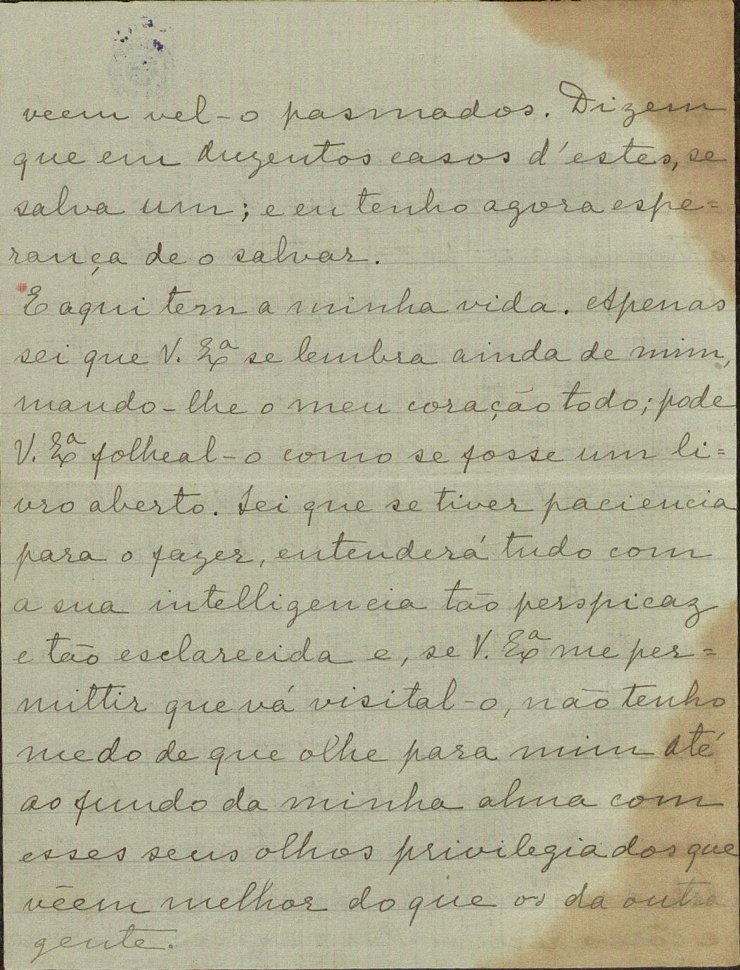 Não podia o Ayres encarregar-me da missão que mais profunda satisfação me desse, primeiro pelo ensejo de me dirigir a V. a quem há tantos anos conheço de nome e que tanta consideração e sympathia me inspira, em segundo logar, para lhe falar da creatura excepcional que seu filho escolheu p.ª companheira da sua vida.