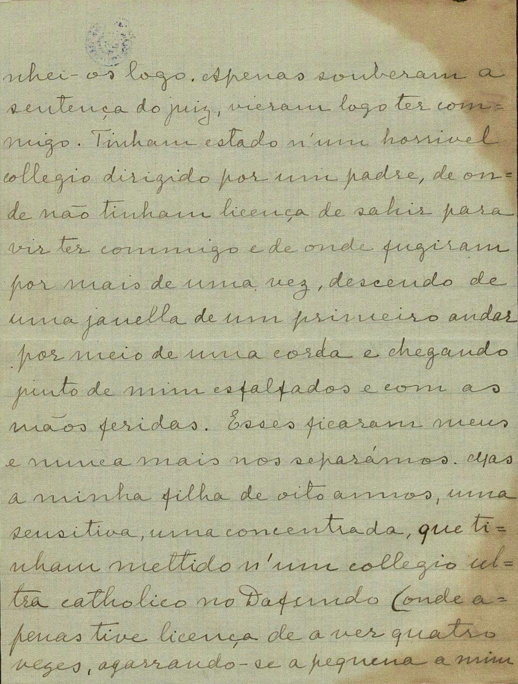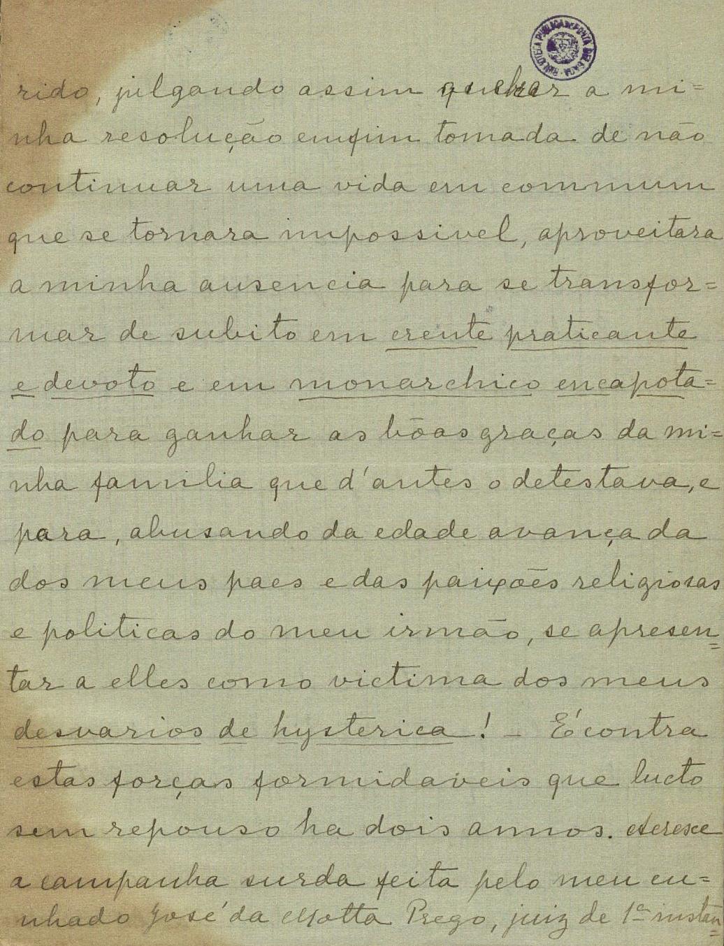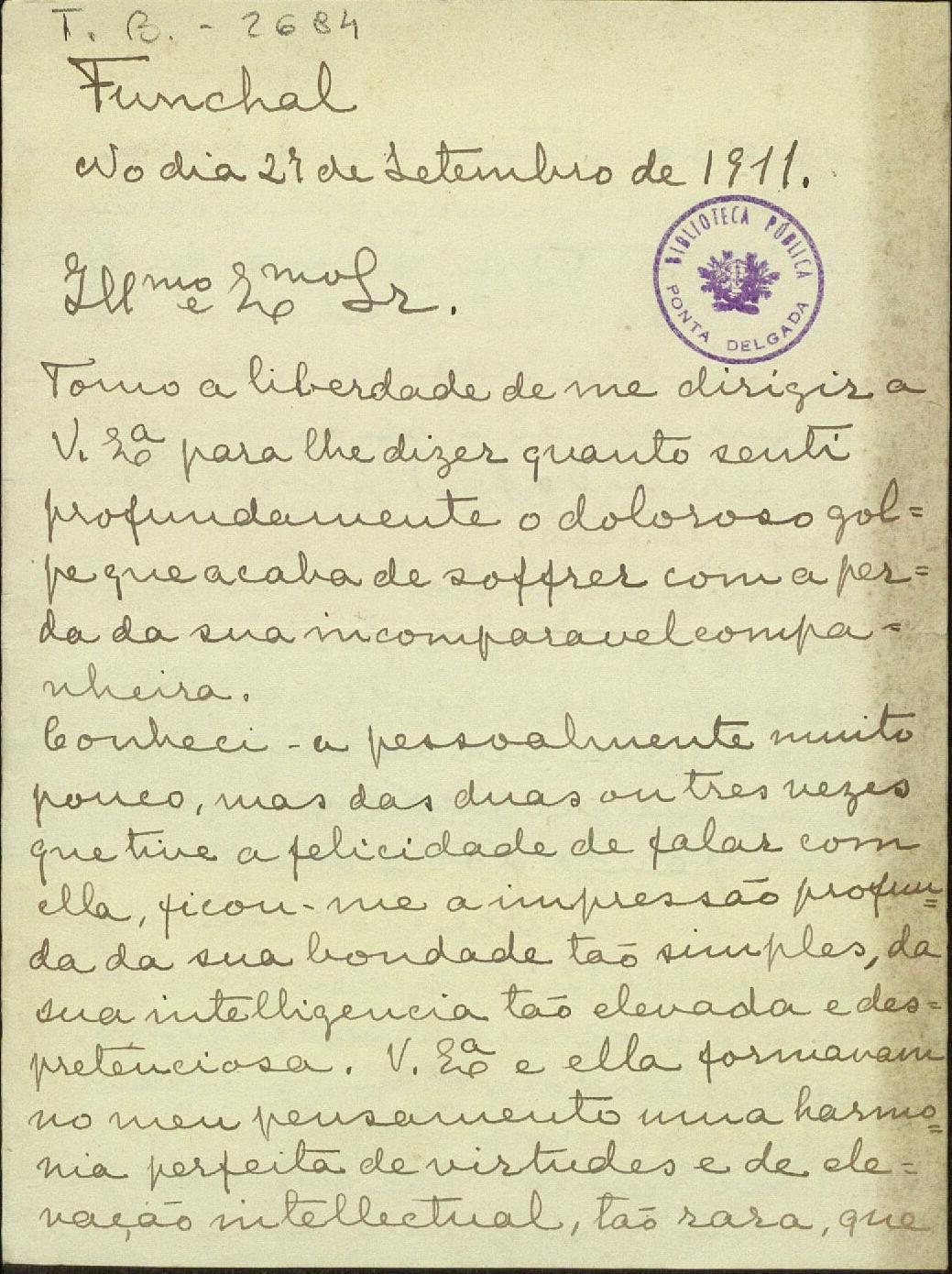 Não podia o Ayres encarregar-me da missão que mais profunda satisfação me desse, primeiro pelo ensejo de me dirigir a V. a quem há tantos anos conheço de nome e que tanta consideração e sympathia me inspira, em segundo logar, para lhe falar da creatura excepcional que seu filho escolheu p.ª companheira da sua vida.