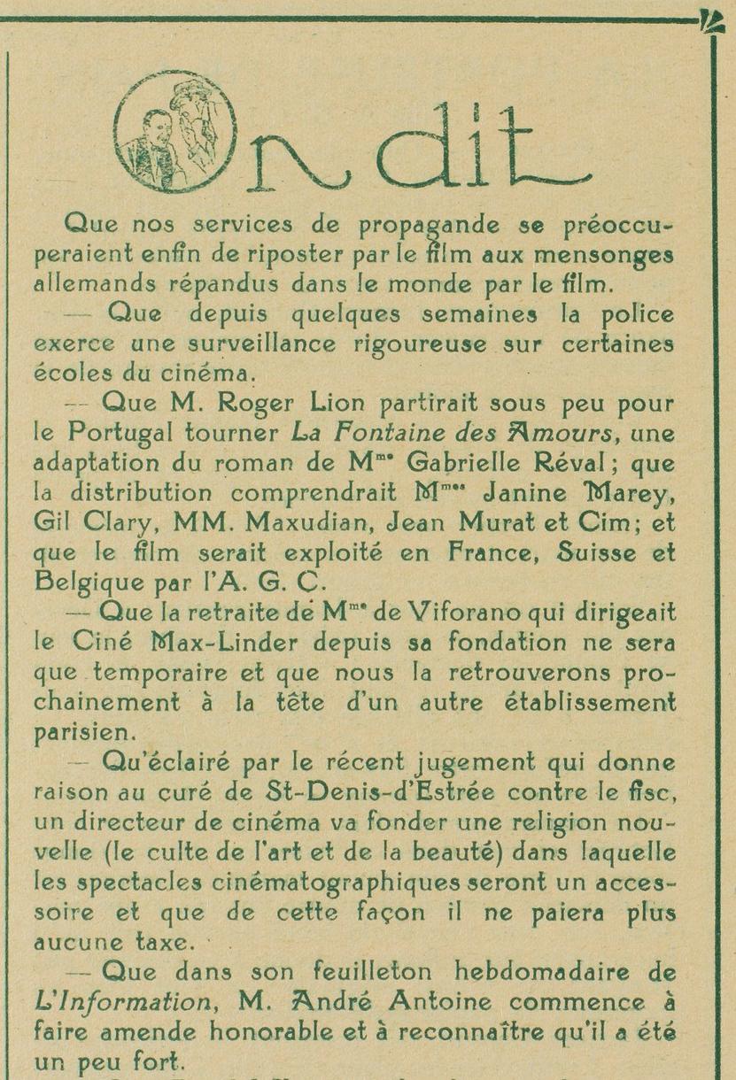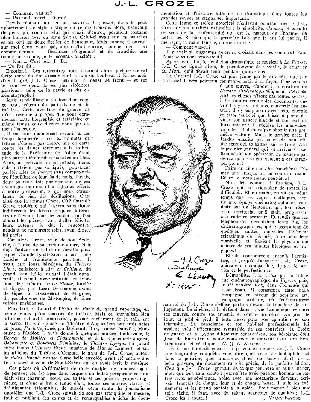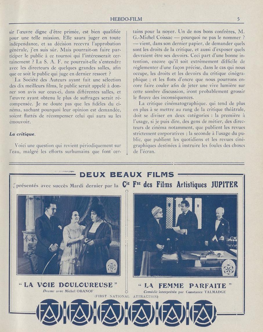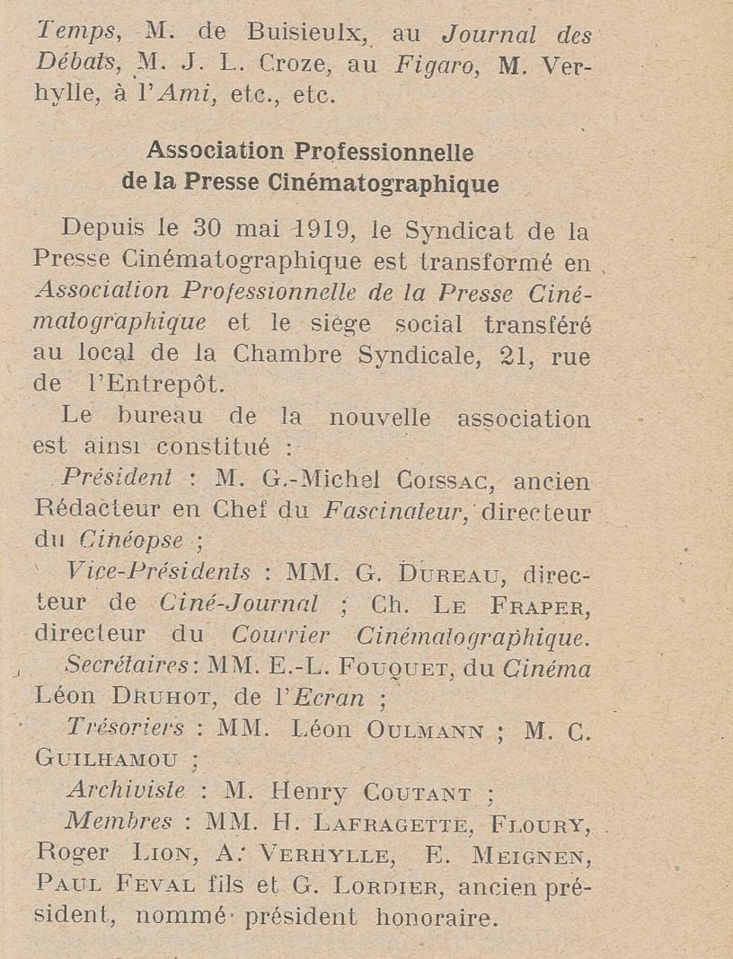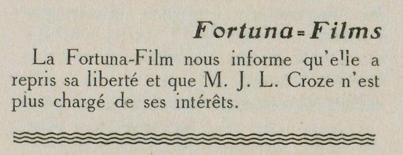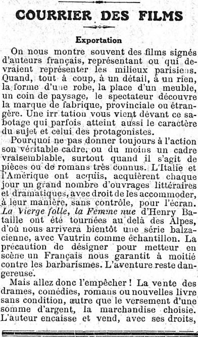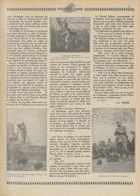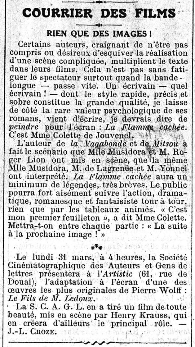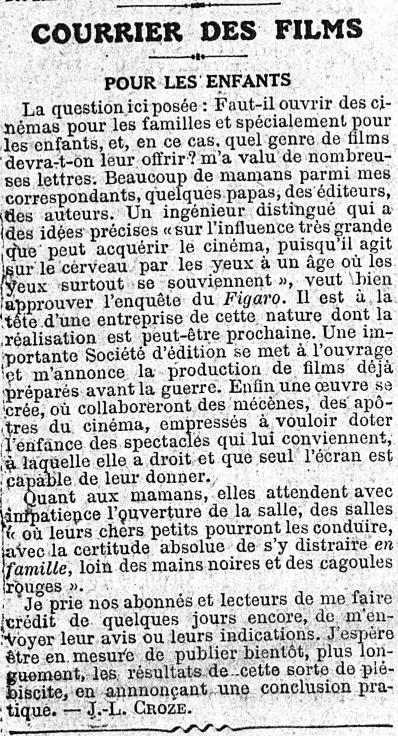 O jornalista, crítico e vendedor de filmes J.-L. Croze assinara desde 16 de março de 1919 no diário Le Figaro uma nova coluna: Courrier des Films , de que se apresentam na página seguinte.