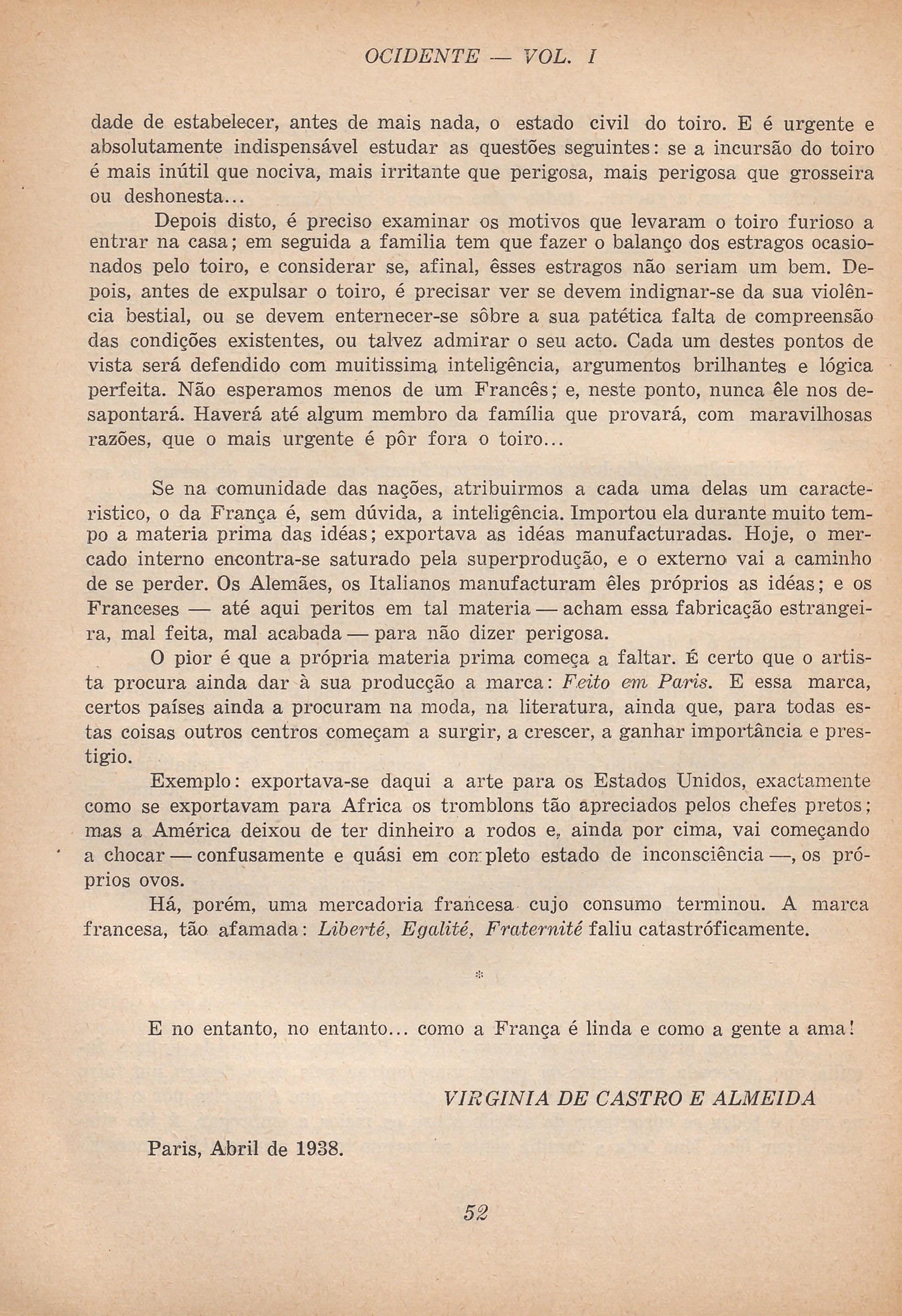 Junho de 1938: Virgínia de Castro e Almeida escreve a terceira epístola para o 3.º número da Ocidente (1938–1945), revista mensal dirigida por Manuel Múrias, tendo como proprietário, redactor-gerente e editor Álvaro Pinto.