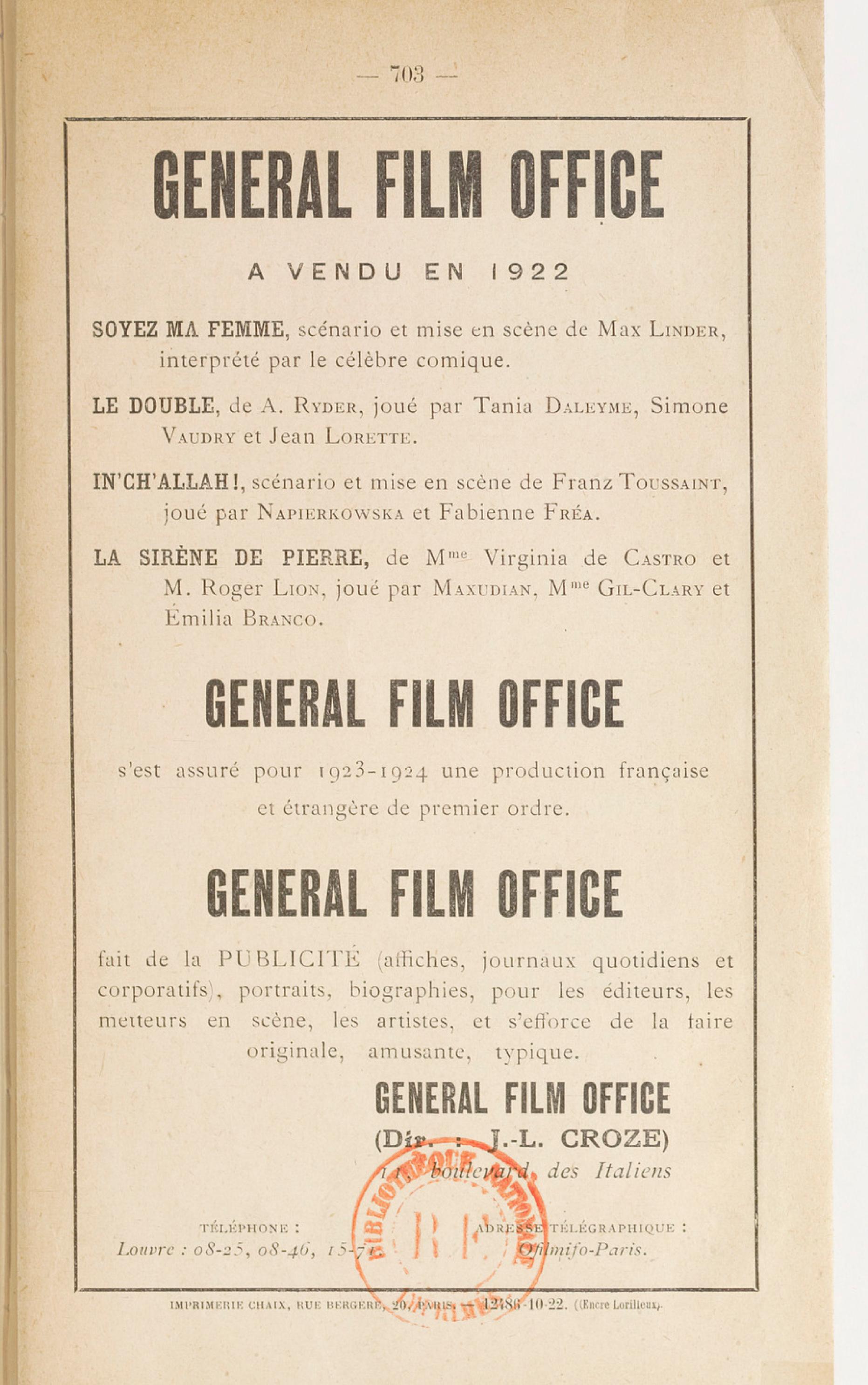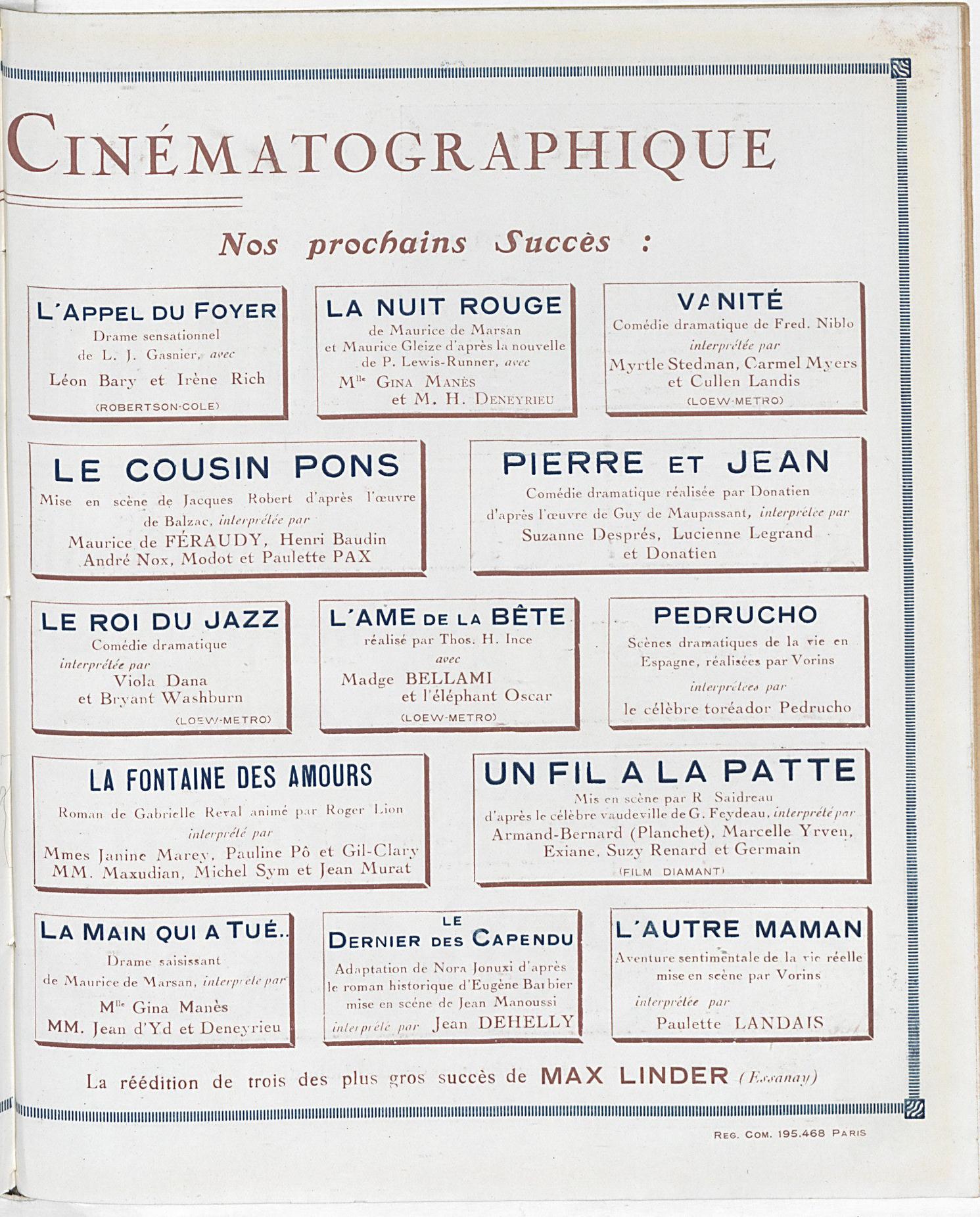 Tiremos temporariamente o chapéu de crítíco a Croze, para lhe mostrar a careca, ao pôr em evidência os seus interesses, o outro chapéu de vendedor de filmes na sua General Film Office. Na defesa escrita de Max Linder (que concorre comercialmente com Chaplin, olhemos para estas duas excertos de duas páginas de anúncios do mesmo anuário (Le Tout-Cinéma, 1923) e por baixo a página integral correspondente:
