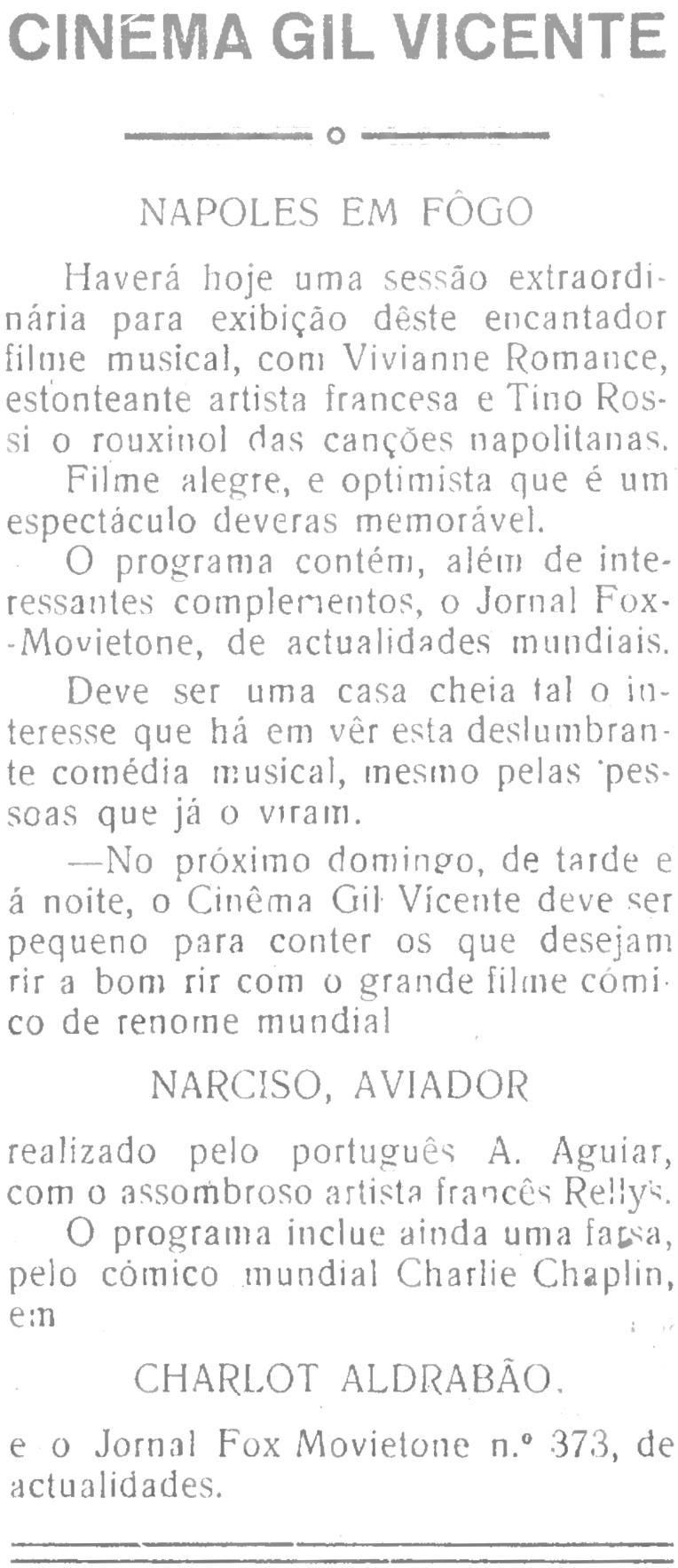 Fizeste muito bem. Pois eu passei um dia aborrecido a passear nas ruas de Lisboa e á noite fui ao cinema ver um film chamado “Narciso - Aviador” onde ri “até bater com as mãos na barriga”. E resume-se isto a passagem do dia de domingo.