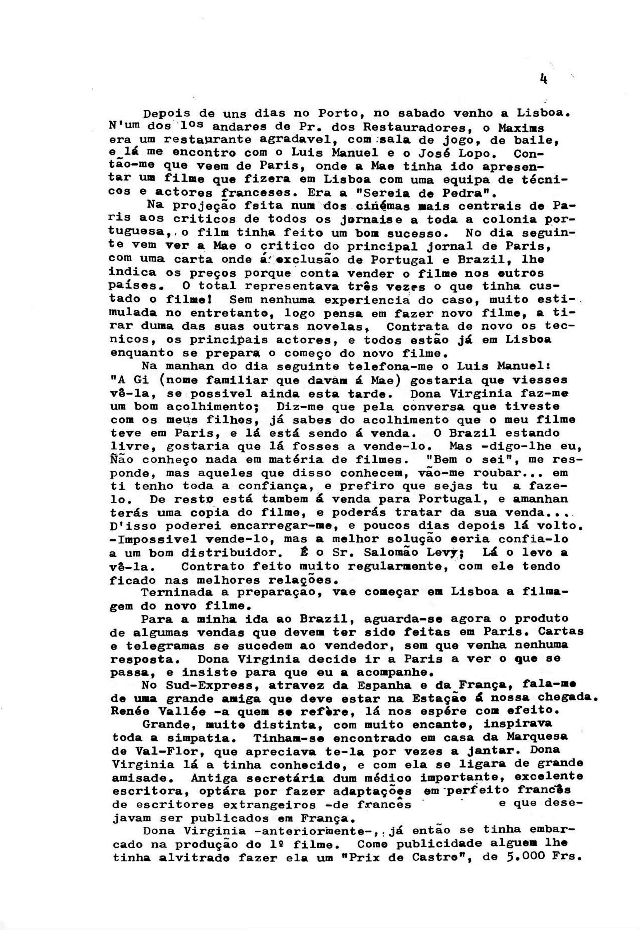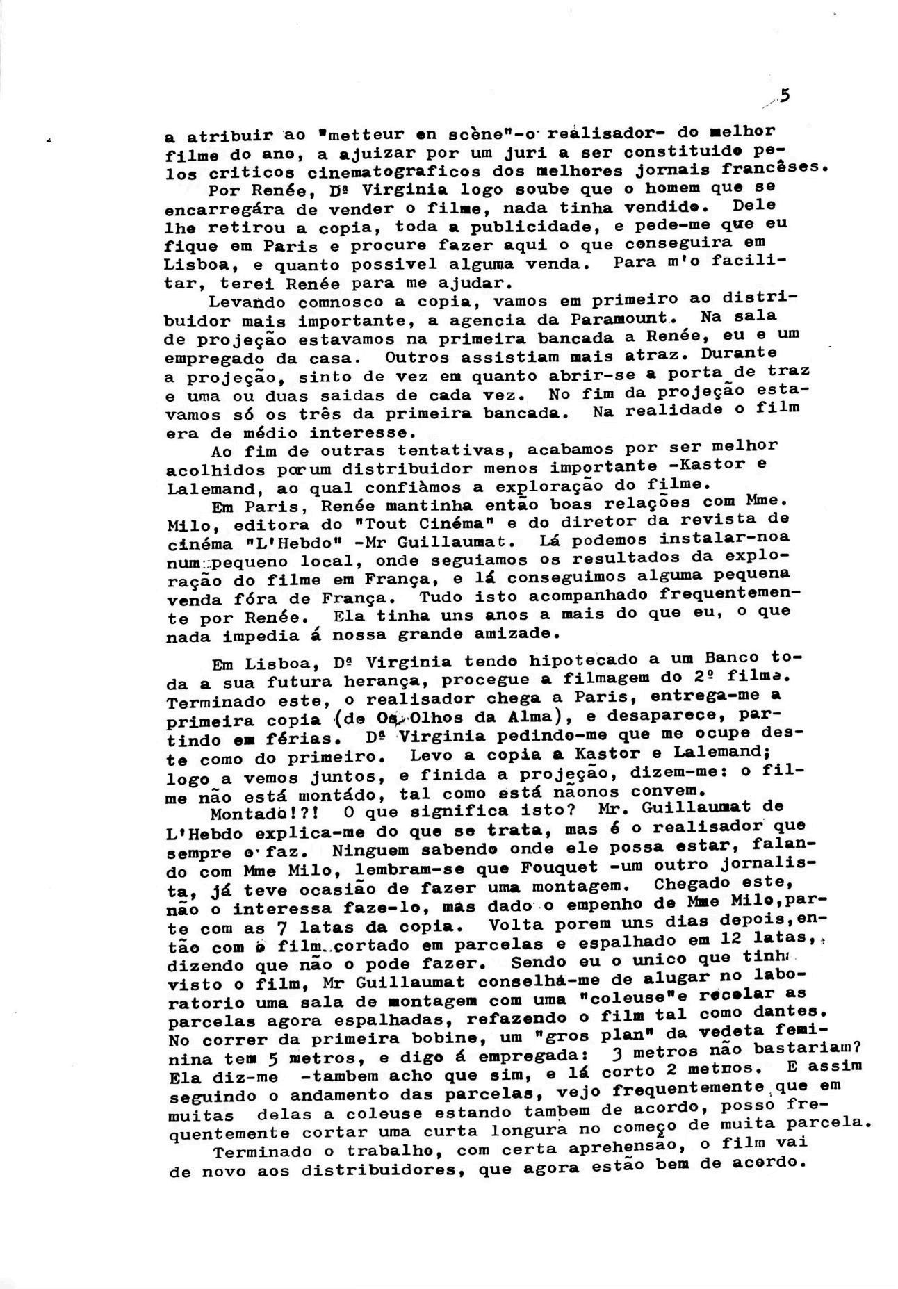 Como previsto, tomei o comboio do sábado à noite, e depois de rápido encontro com o meu diretor de Paris, passei o domingo na minha sala de projeção a discutir com Raymond Bernard da montagem do filme. Ele tinha-se feito acompanhar do seu monteur [montador] e mais 6 ou 7 acólitos para apoiarem o seu trabalho. Em nada me influenciaram; bobine por bobine foi sendo projectada e discutida a montagem. Assim se passou manhã e tarde, mas acabámos de acordo acerca das modificações que eu sugerira.