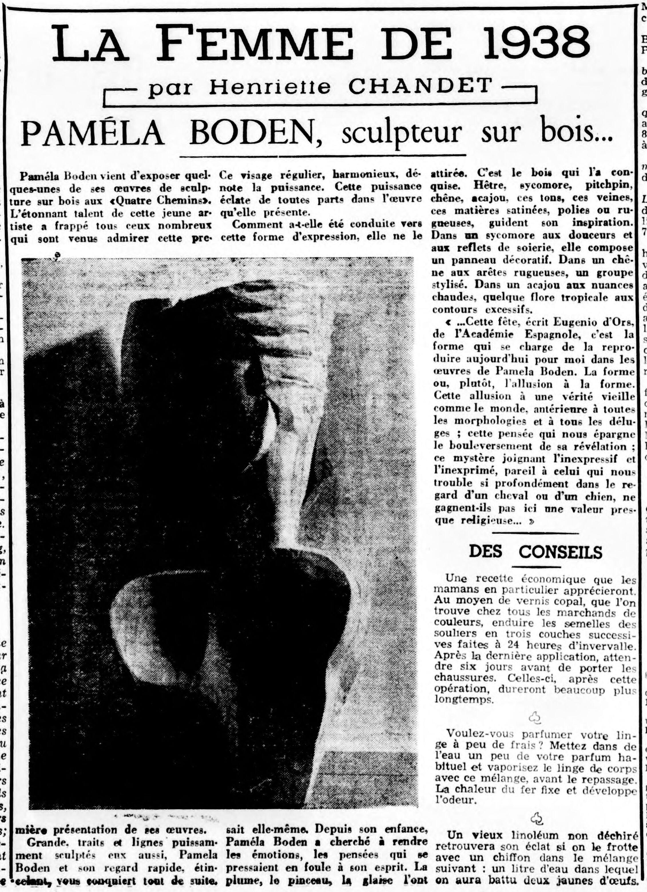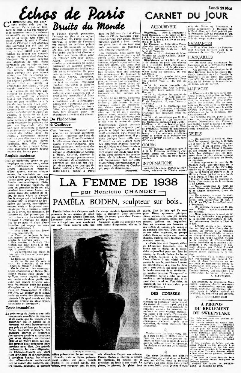 Depois de Virgínia de Castro e Almeida, em 1937, Pamela Boden é La Femme de 1938 para a escritora Henriette Chandet (1901–1989), na coluna que reitera publicar no jornal «L’Epoque» (edição de 23 de maio, 1938). Chandet viria a ser três vezes premiada pela Académie française: 1956, Prix d’Académie por La vie privée de l’Impératrice Eugénie; 1958, Prix Broquette-Gonin (philosophie) por Louis, Prince impérial; e em 1962, Prix Broquette-Gonin (littérature) por Napoléon III, homme du XXe siècle.