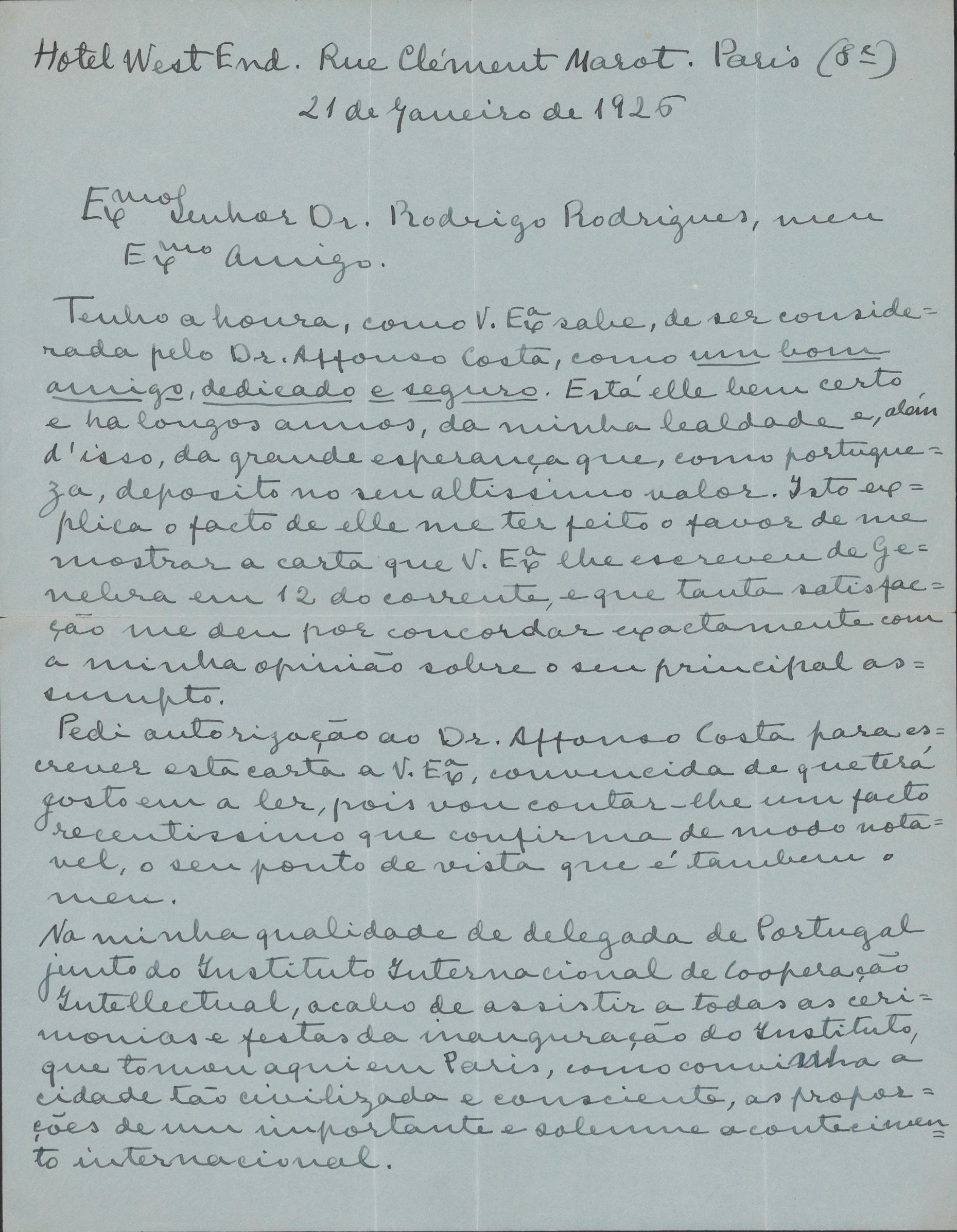 Tenho a honra, como V. Ex.ª sabe, de ser considerada pelo Dr. Affonso Costa, como um bom amigo, dedicado e seguro. Está elle bem certo, e há longos annos, da minha lealdade e, além d’isso, da grande esperança que, como portugueza, deposito no seu altissimo valor. Isto explica o facto de elle me ter feito o favor de mostrar a carta que V. Ex.ª lhe escreveu de Genebra em 12 do corrente, e que tanta satisfação me dei por concordar exactamente com a minha opinião sobre o seu principal assumpto.