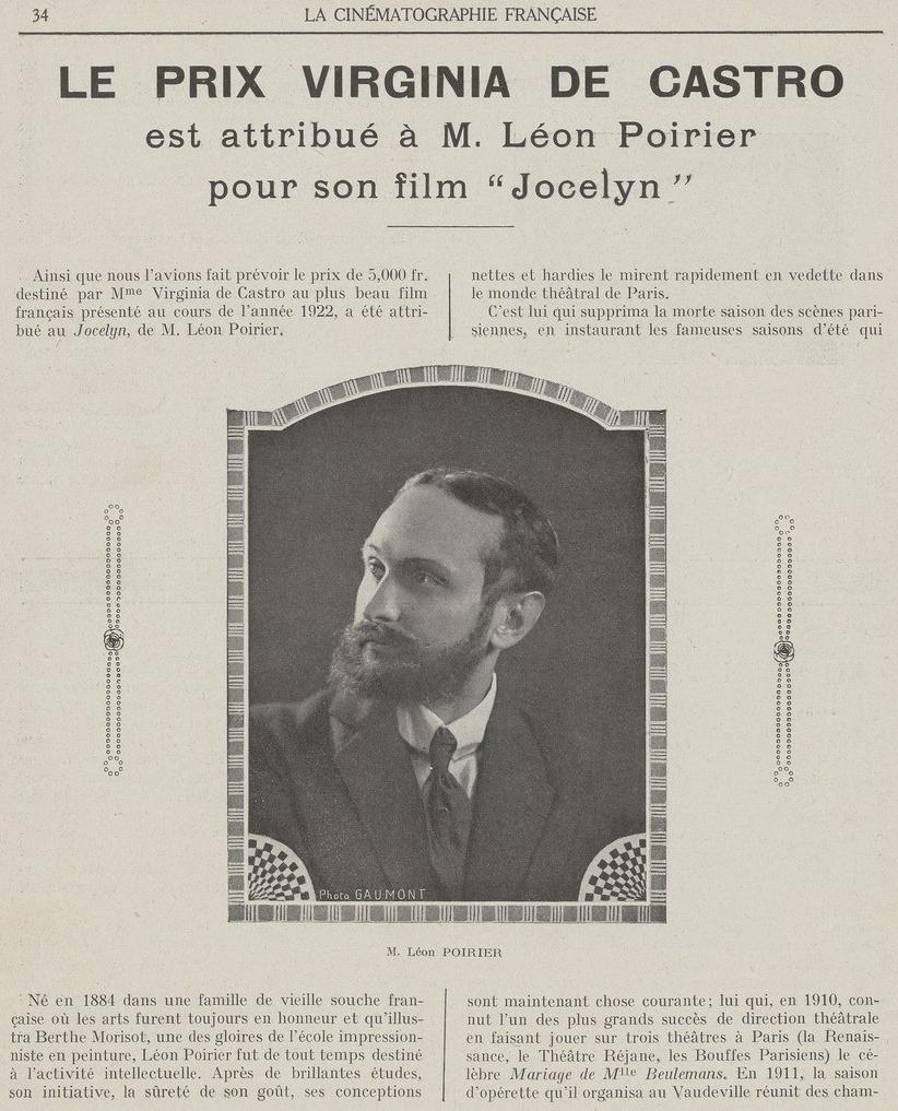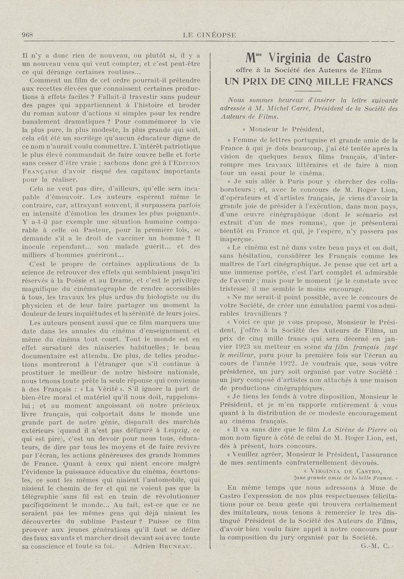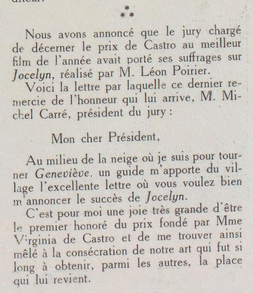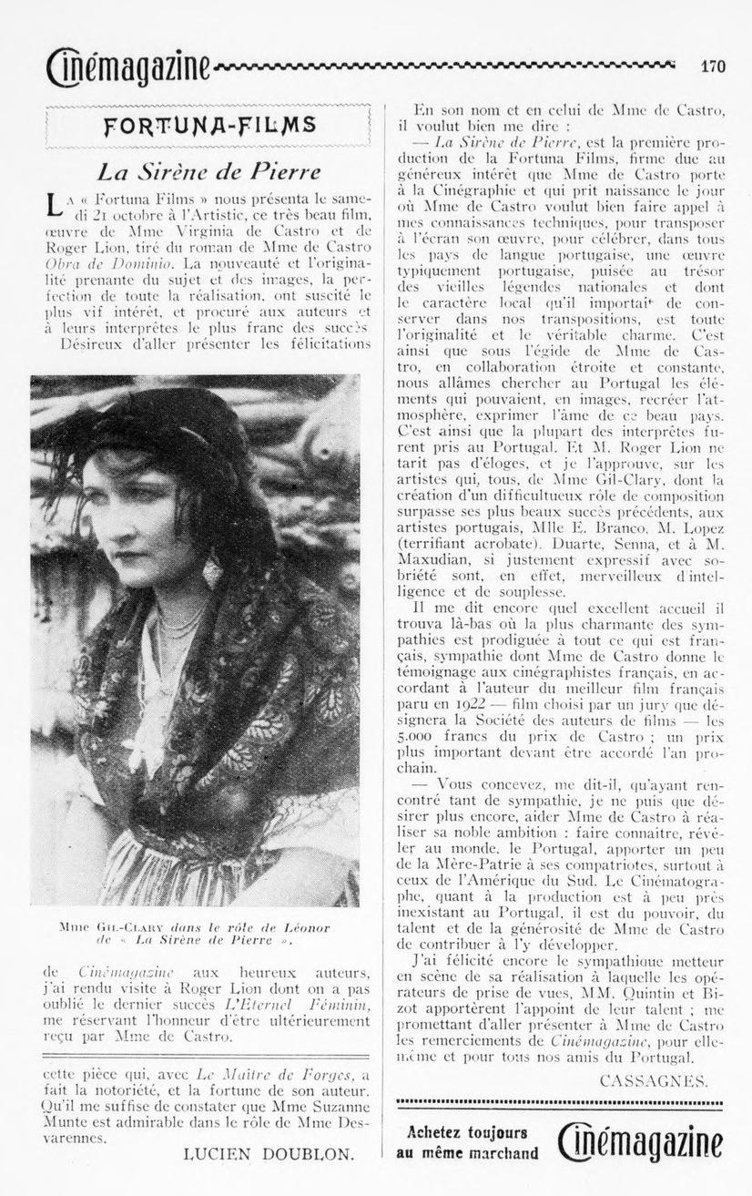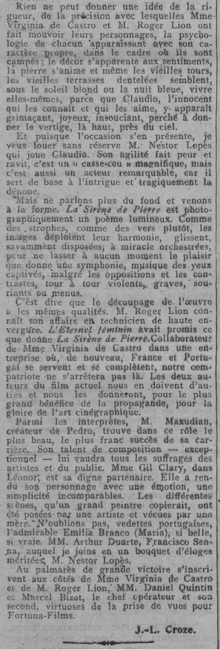 Com a outra mão escreve tanto sobre A Sereia de Pedra (Comœdia, 27 de outubro, 1922), como nos elogios a Max Linder, de quem, como vimos, tinha também para venda o Soyez ma femme. Será também menos visível mão na successão do Prix de Castro (mais adiante).