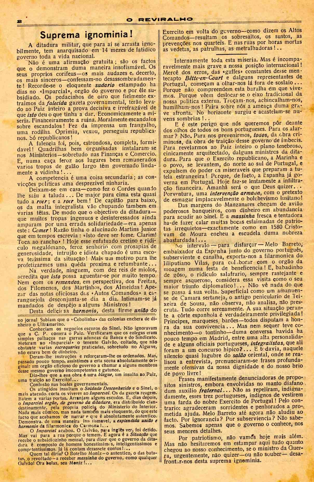 Falando-se a respeito de colónias, da última Assembleia de Genebra, e de Locarno, disse eu que, em Portugal, a opinião pública manifestaca uma certa inquietação ao pensar nas nossas possessões d’África. Loucheur respondeume que essa inquietação era infundada e que Portugal nada tinha que recear n’esse ponto. “E’ preciso não esquecer que temos uma terrível amiga”, disse eu. Painlevé sorriu e Loucheur riu francamente. Isto animou-me a continuar: “E de resto, viu-se na última Assembleia de Genebra, com que vigor fomos atacados”.