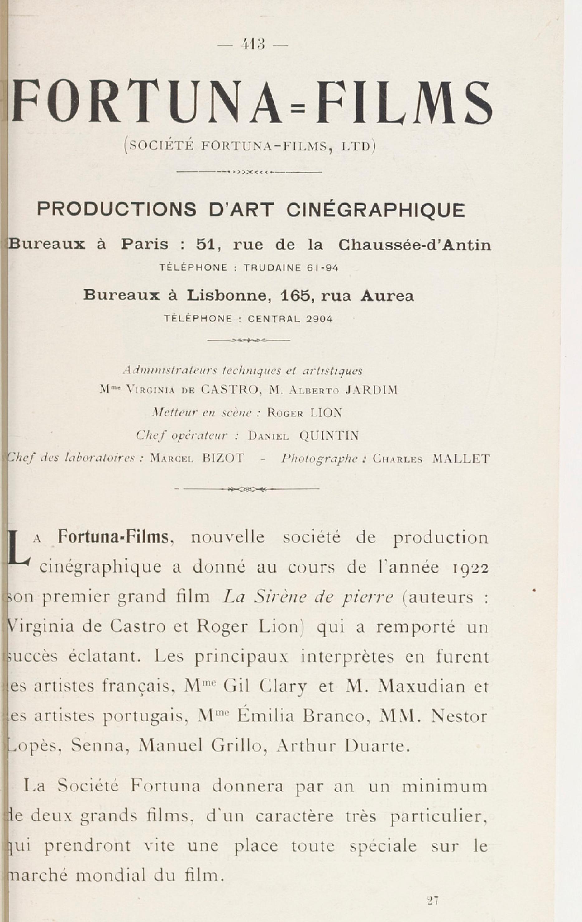 Em 1923, a G.F.O. — General Film Office — de J.-L. Croze perdia para a A.G.C. a distribuição dos filme que tinha e futuros de Virgínia de Castro e Almeida.